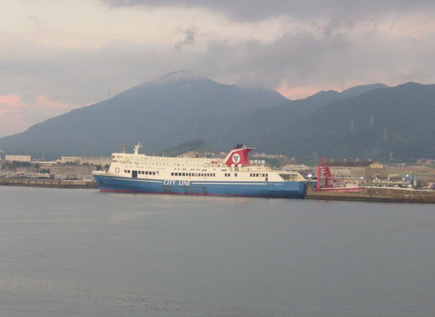 しかし、門司港から乗ったJR車窓から、8時30分門司港着のはずの釜山からの国際フェリー「KCブリッジ」が見えるではありませんか?!まだ、朝7時過ぎなんですが、どうやら税関の問題で早着するようです...(-_-;)。