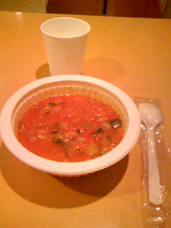 朝は4時30分頃に起き、まだ閑散としているオーシャンプラザで朝食をとりました。今回は、「トマトと牛挽き肉のリゾット」自販機の中では、あっさりめのを選びました。