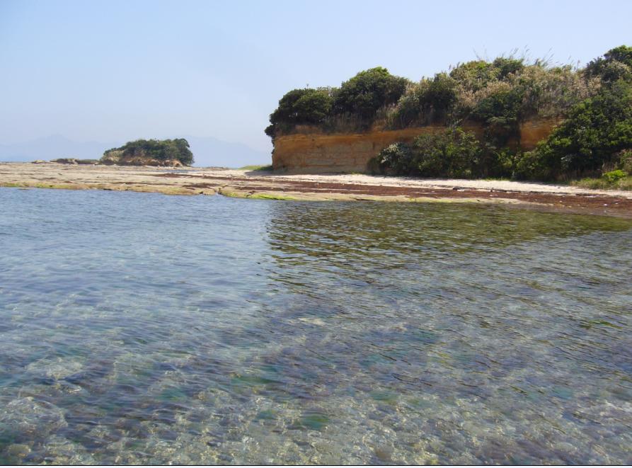途中、離島ならではの「ナンバープレートの無い軽トラやスクーター」とすれ違います・・・。また、離島ではおなじみの猫が、この藍島にもいっぱいいました・・・。1車線の細い舗装道を歩いて30分ほどで「千畳敷」に到着。小倉近郊とは思えない海のきれいさと景色でした。