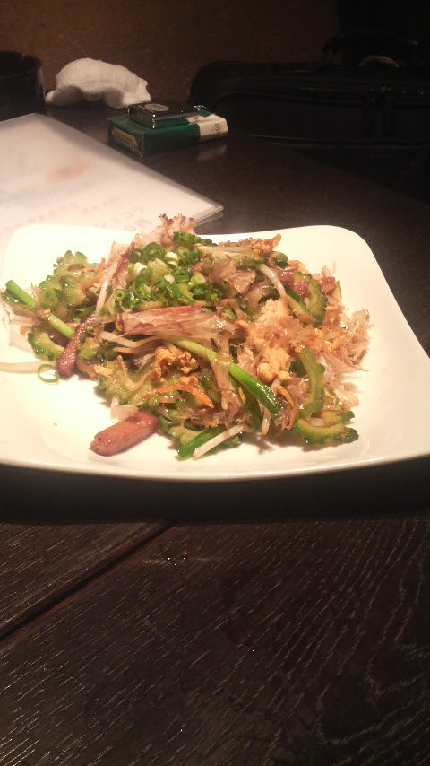 「kijimuna」の店内は、おしゃれな雰囲気でした。いわゆる女性客を狙った作りなのでしょうか?まずは、オリオンビールで乾杯し、ゴーヤチャンプルとスーチカ(豚バラ肉の塩漬け)をツマミに店オリジナルの泡盛を飲みました。