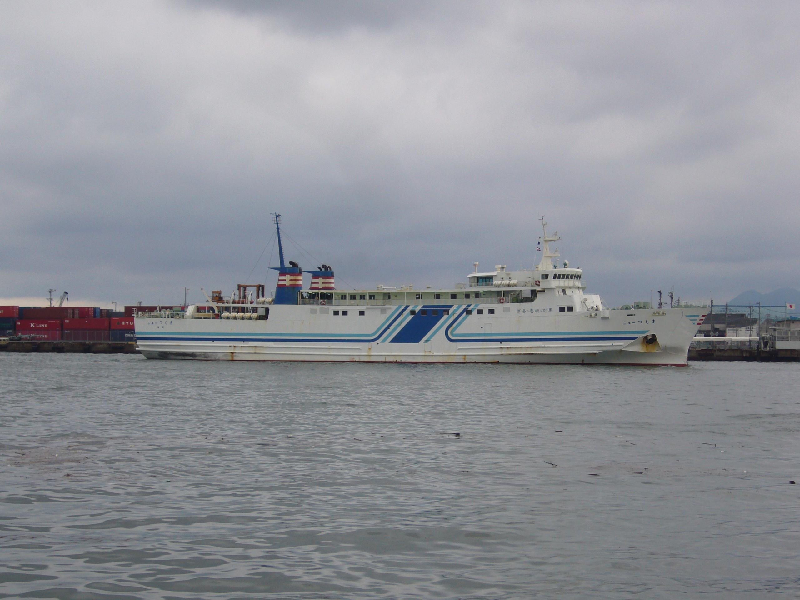 「ニューかめりあ」出港後、博多ベイサイドプレイス向かいにある日帰り温泉「波葉の湯」で一風呂入ってくつろいだ後、九州郵船のフェリー「ニューつしま」を撮影しました。
