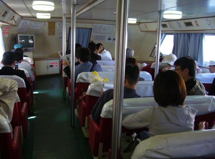 さっそく藍島行「こくら丸」に乗船します。こくら丸は73トン、定員180人(立客含む)、航行速度20ノットの小型旅客船です。船内の客室部分は、2階建になっており、1階に70人程が座れる座席の客室とトイレがあります。2階はベンチ席の外部デッキになっており、既に船内・外部デッキ共にほぼ満員でした...。