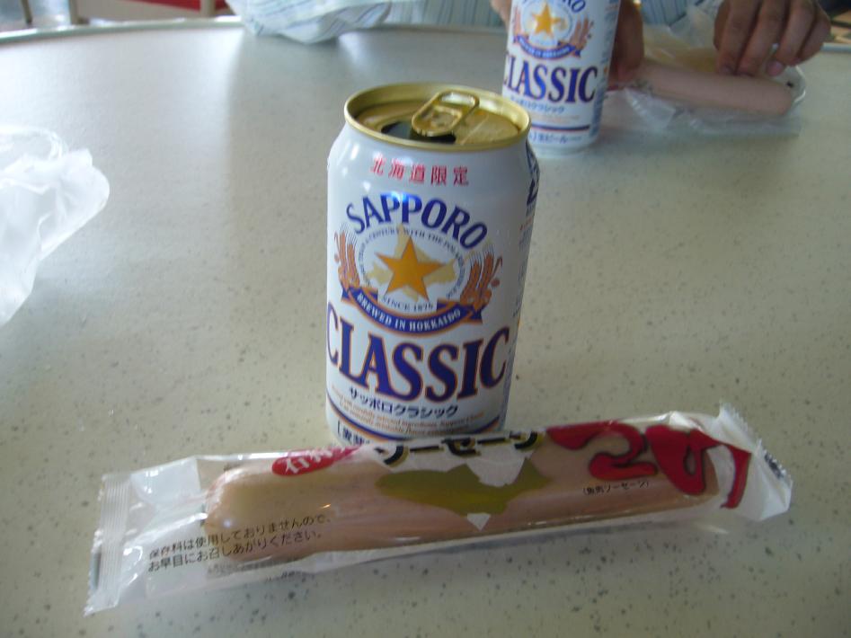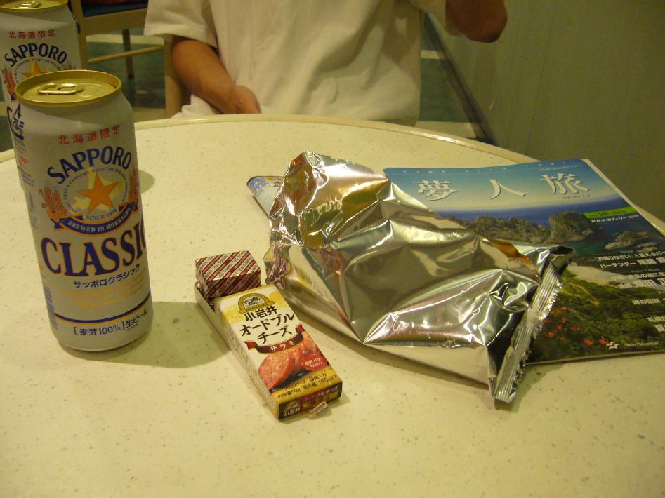 出港シーンを見た後、船内売店でつまみ・おにぎり・缶ビールを買いました。売店は夜1時半まで開いており、ビールやつまみ、おみやげが飛ぶように売れていました...。なお、缶ビールは北海道へ向かっているということもあり、サッポロビールクラシックにしました(^^)。
