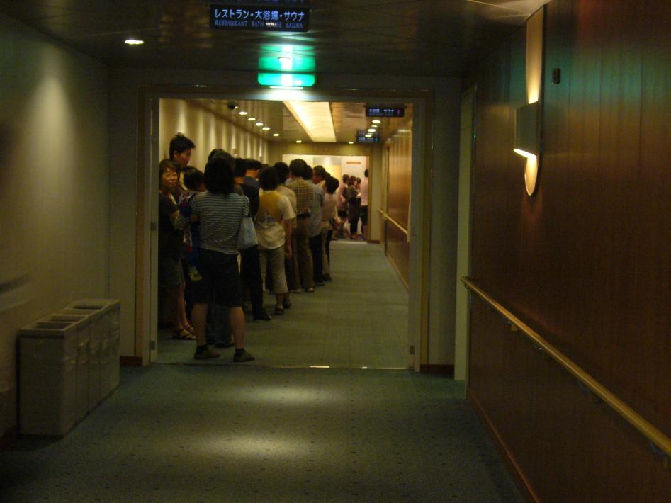 目が覚めた後、夕方となり外部デッキから夕焼けのシーンを撮りまくりました。しばらく、外部デッキでたむろしてましたが、レストランの夕食開始時間前に早めにならぶ事にしました。で、やっぱり行列が出来ていました・・・。夕食も昼食と同様カフェテリア式でした。