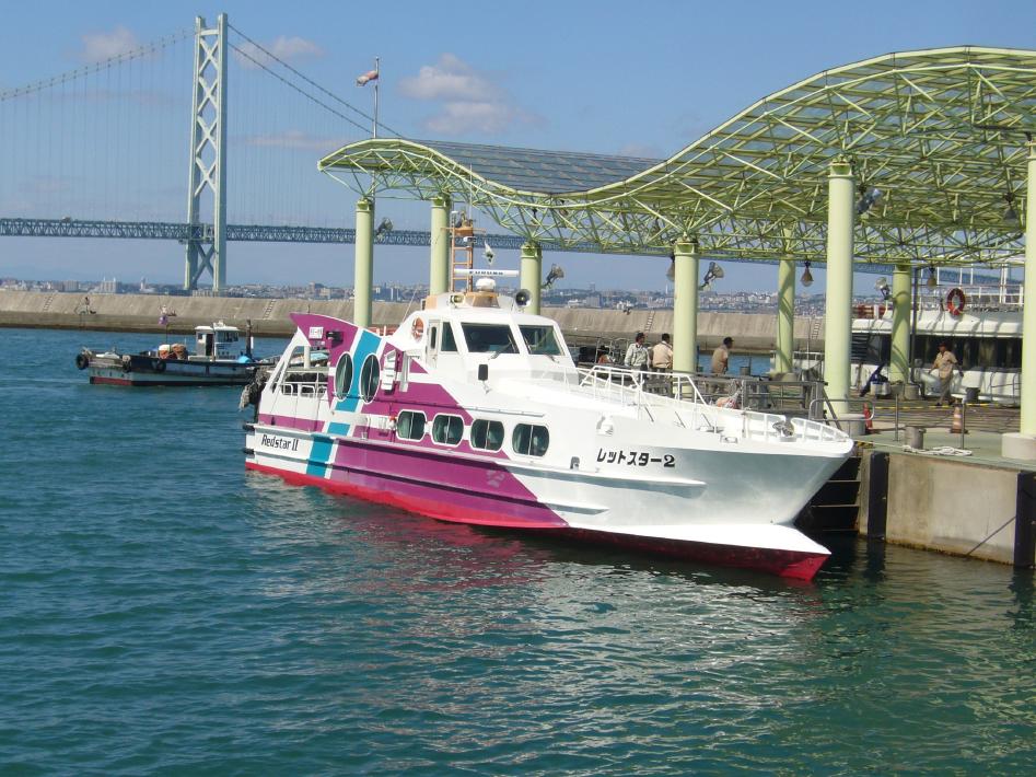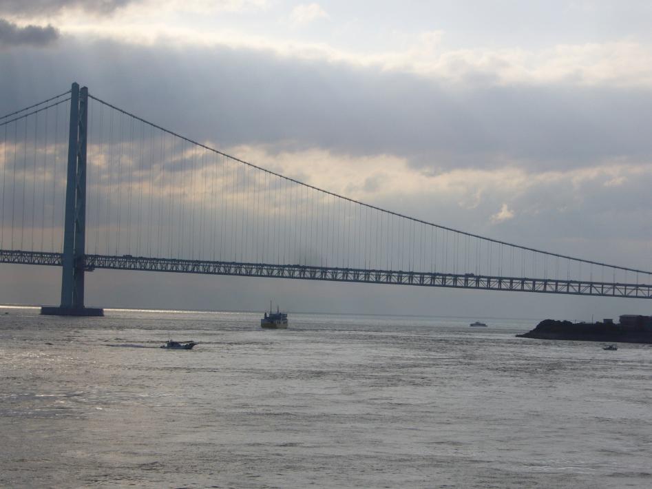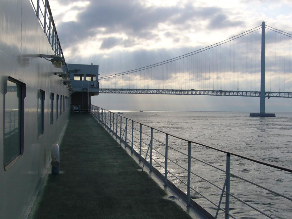 今回は、寝台上段でしたがぐっすり熟睡でき、起きたのは朝7時過ぎでした。 身支度をして外部デッキに出てみると、ちょうど前方に明石大橋が見えて来ました。外部デッキは次第に明石大橋を見物する乗船客でいっぱいになりました。明石大橋通過時にタコフェリーのあさかぜ丸の航行する姿を撮影できました。