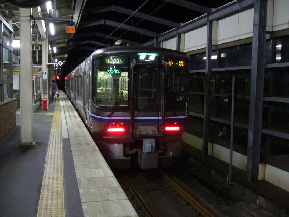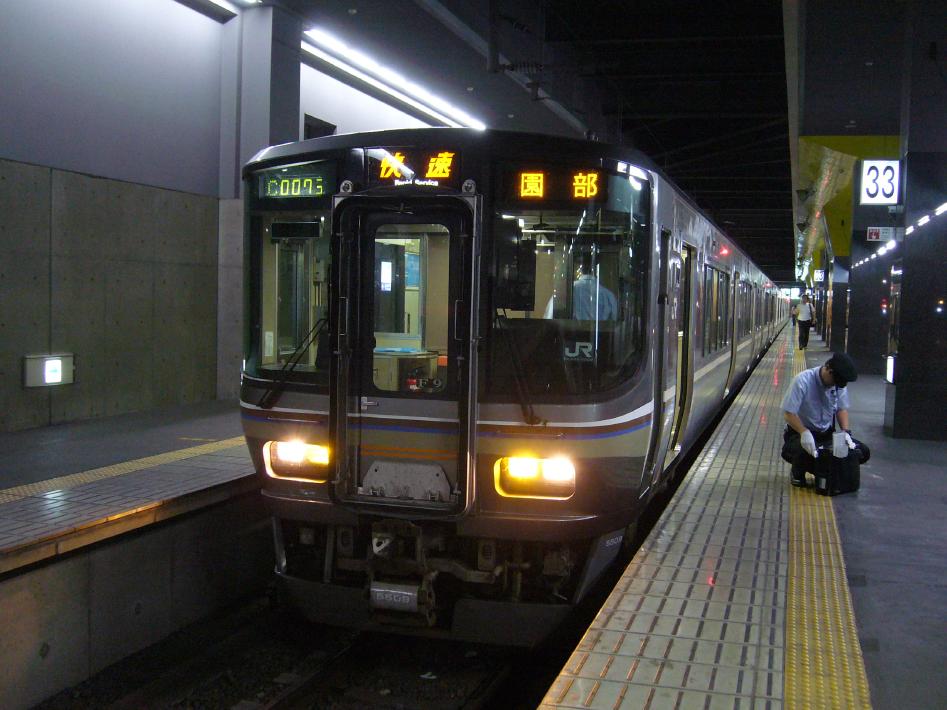 車内は学生や地元客でいっぱいでした。キオスクで買った缶ビールとつまみでいっぱいやっているうちに19時33分園部到着。隣ホームに停車している19時34分福知山行223系3両編成に乗り換えます。綾部には20時26分到着。昔はキハ47ディーゼルの普通列車で2時間かかっていたんですが、乗り心地のいい転換クロスシートの221・223系に乗り、1時間40分程で着くというのは、本当に快適になりました...。