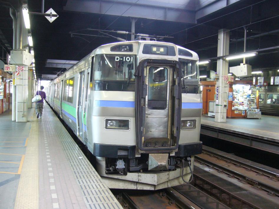 新川駅到着後、S君から教えてもらった「1日散歩きっぷ(2200円)」を購入しました。このきっぷは、札幌近郊の指定エリアの普通列車自由席が1日乗り放題となるきっぷです。まずは、新川駅から札幌行の普通に乗りました。車両は50系客車を改造したディーゼルカー・キハ141系6両編成でした。高架の線路を10分程走って札幌到着。