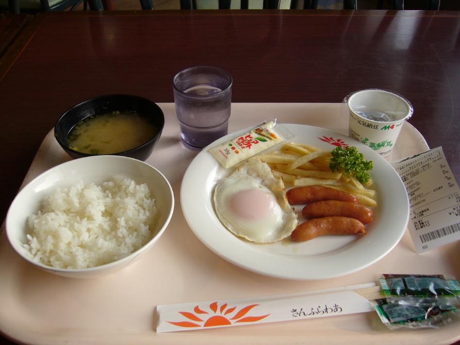 翌朝目が覚めたのは、松山港入港の船内放送があった朝6時過ぎでした。眠さが残る中、身支度をし6時30分過ぎレストランに行きました。ダイヤモンドフェリーの朝ご飯は高いと噂を聞いていましたが、目玉焼とソーセージ・サラダの付け合わせ420円、納豆80円、ご飯中150円、味噌汁120円合計770円と値下げしたせいなのか?意外に良心的な価格でした。ただ個人的には朝食はバイキング又はセットがいいような気がします...。