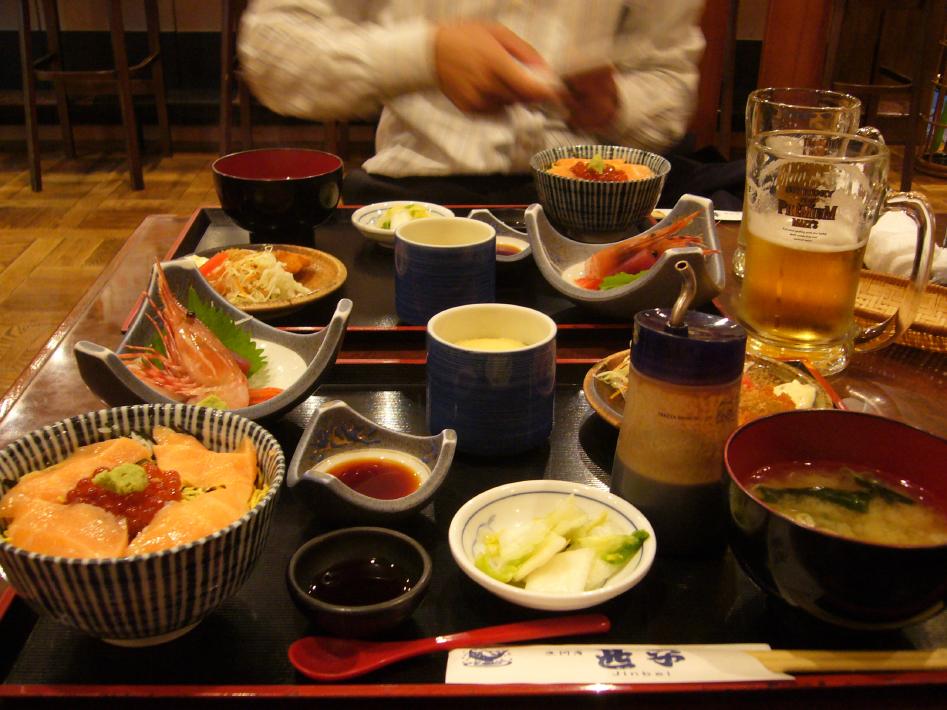 JR札幌駅に再び戻り、14時頃遅い昼食を駅パセオ地下1階の郷土料理屋「甚平」にて食べました。生ビールと刺身・鮭いくら丼・鮭フライ等の北海道尽くしの定食を頼み、北海道最後の食事をしました。