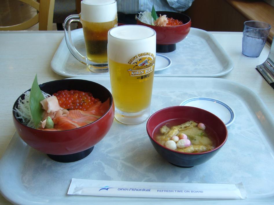 あっという間にレストラン昼食の開始時間前となり、レストランに向かいましたが、やはり列が出来ていました...。今日のお昼はカフェテリア式のようです。お昼は、せっかく北海道へ向かっているので、北海道らしい鮭いくら丼と生ビールを選びました。なお、500円を機械に投入し、ジョッキをセットすれば自動的に泡がきれいで美味しそうな生ビールが出来上がる珍しい機械がありました。なお、鮭いくら丼は朝食を食べ過ぎたのもあり、量も適度でおいしかったです^^;。