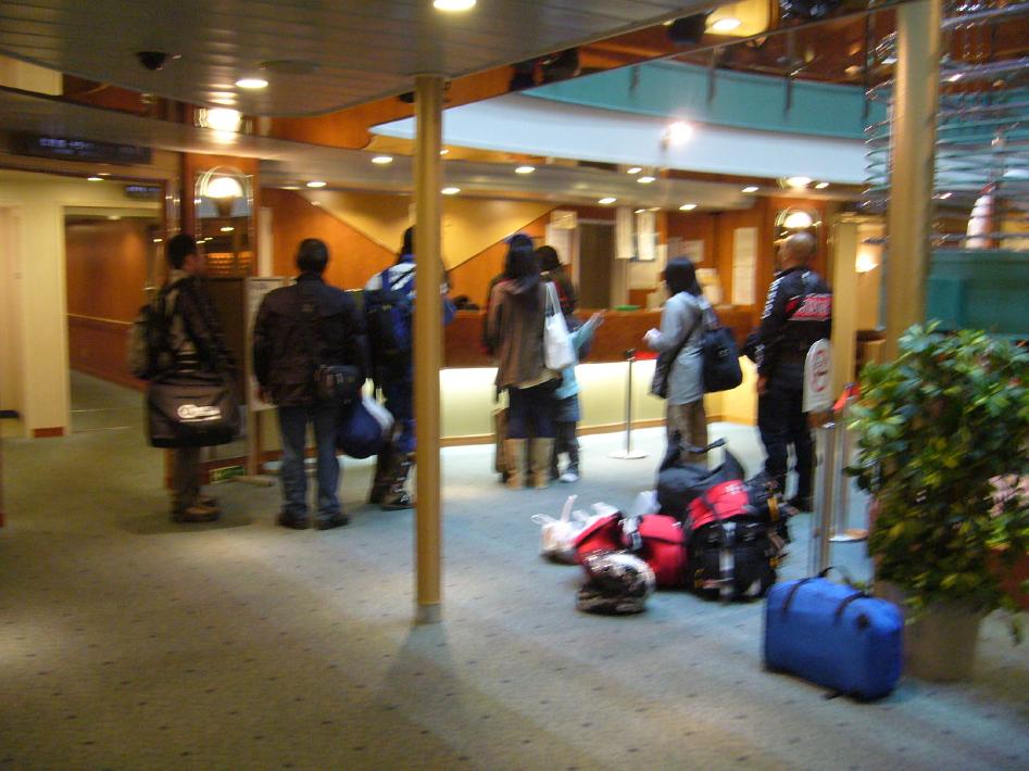 フェリーターミナルの駐車場は、乗船待ちのマイカー・バイク・トラックでいっぱいでした...。さっそく、乗船手続を行います。舞鶴から小樽まで2等座敷で9000円。安いです。なお、2等寝台に変更を試みましたが、スイート・特等以外満席でした...。実際、今日はほぼ満員のようです・・・。
