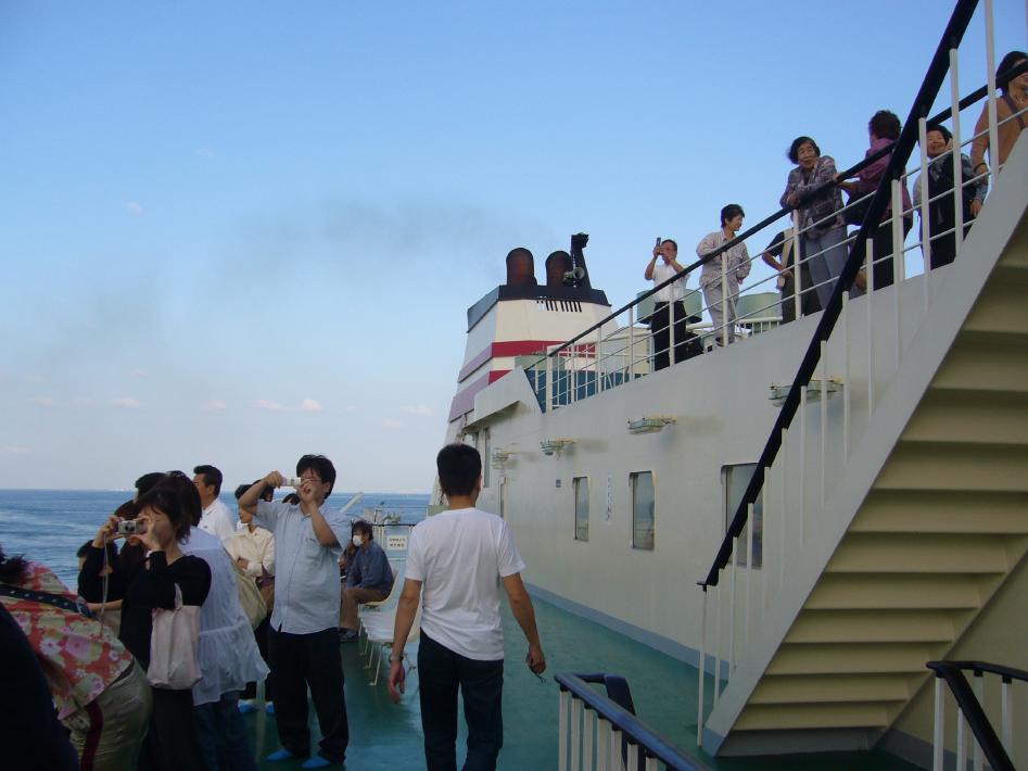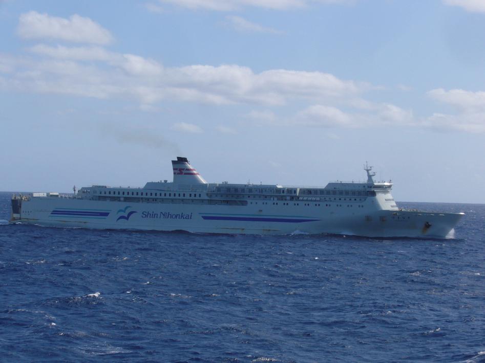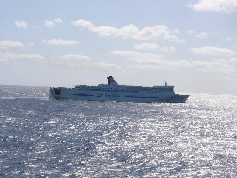 朝食後、船内をぶらつきながら10時半頃予定の僚船はまなすとのすれ違いを待ちました。フォワードサロンでS君と前方を見ている時、前方から小さく僚船はまなすが見えて来たので、すかさず後部デッキへ移動しました。