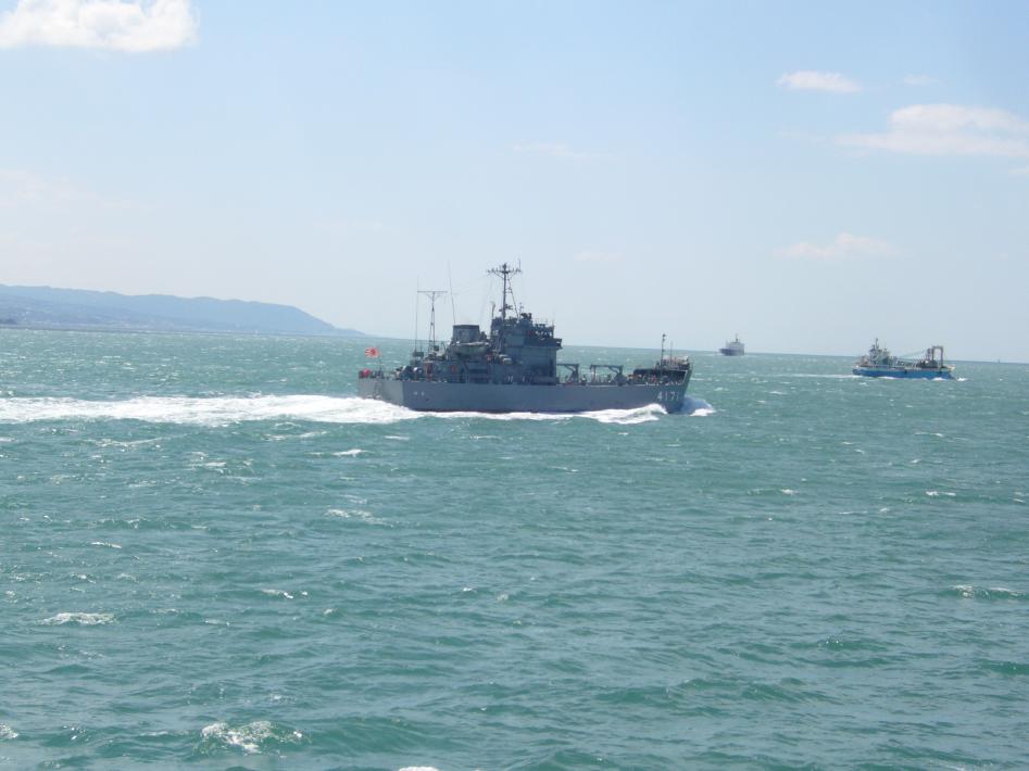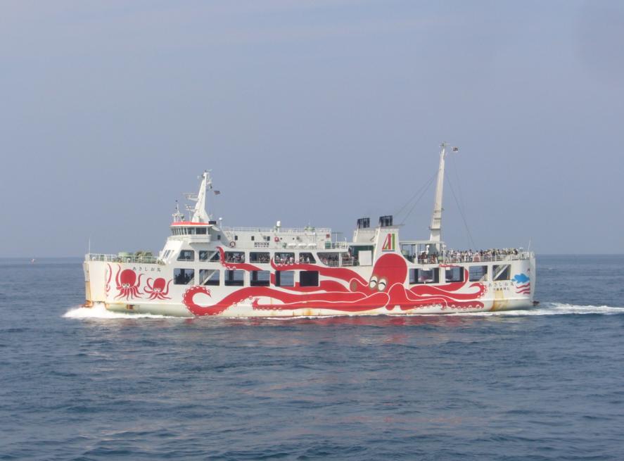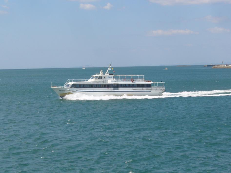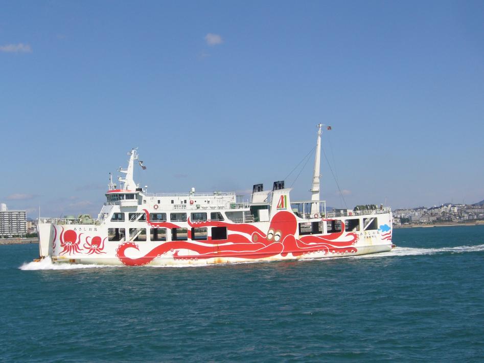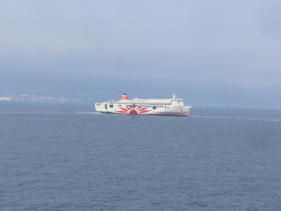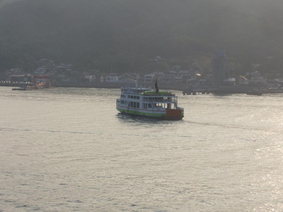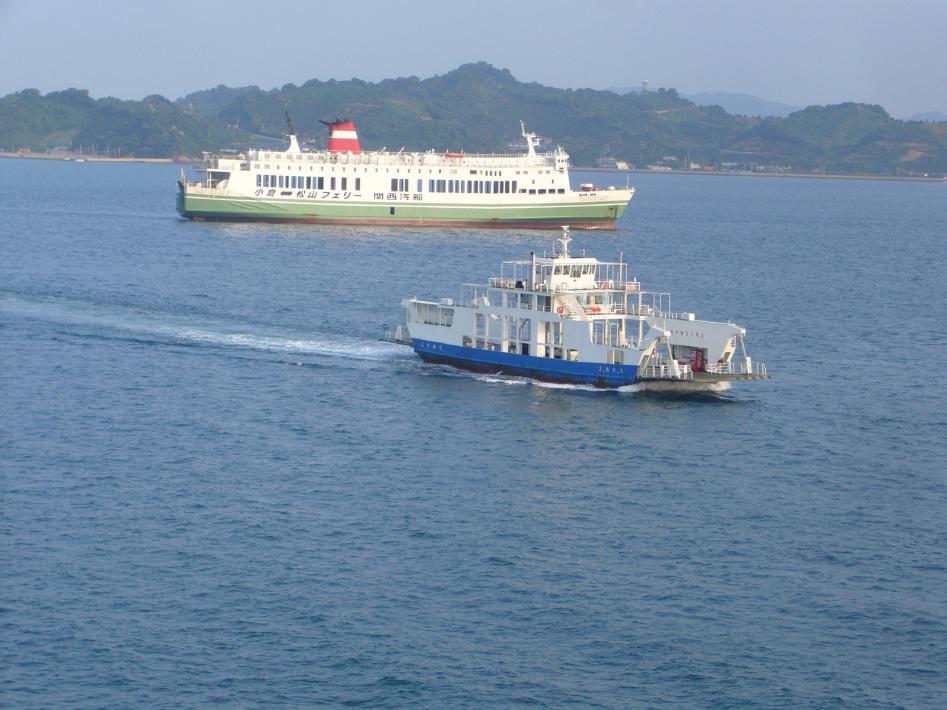 朝食後は外部デッキに出て、松山観光港出港シーンを見届けました。その時、沖止めされている関西汽船の「フェリーくるしま」と興梠島汽船の「フェリー愛媛2」、中島汽船のフェリー「なかじま」を立て続けに撮りまくりました。船好きにとってまさに、ウハウハです...^^;。