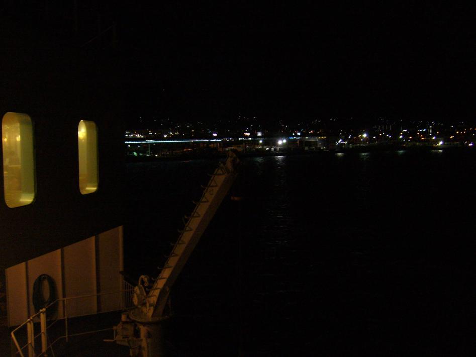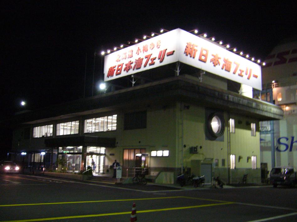 夕食後辺りも暗くなり、入港1時間前には小樽港の光が見えてきました。小樽港20:45着。下船のロビーごった返し、まずマイカー客を同乗者と一緒に下船させ、次にバイク、最後に我々徒歩客が下船しました。小樽フェリーターミナルは、舞鶴港より大きく設備が充実しているようで、フェリーターミナル内に温泉もあるようです。