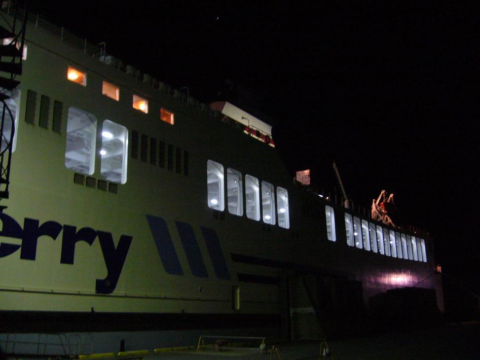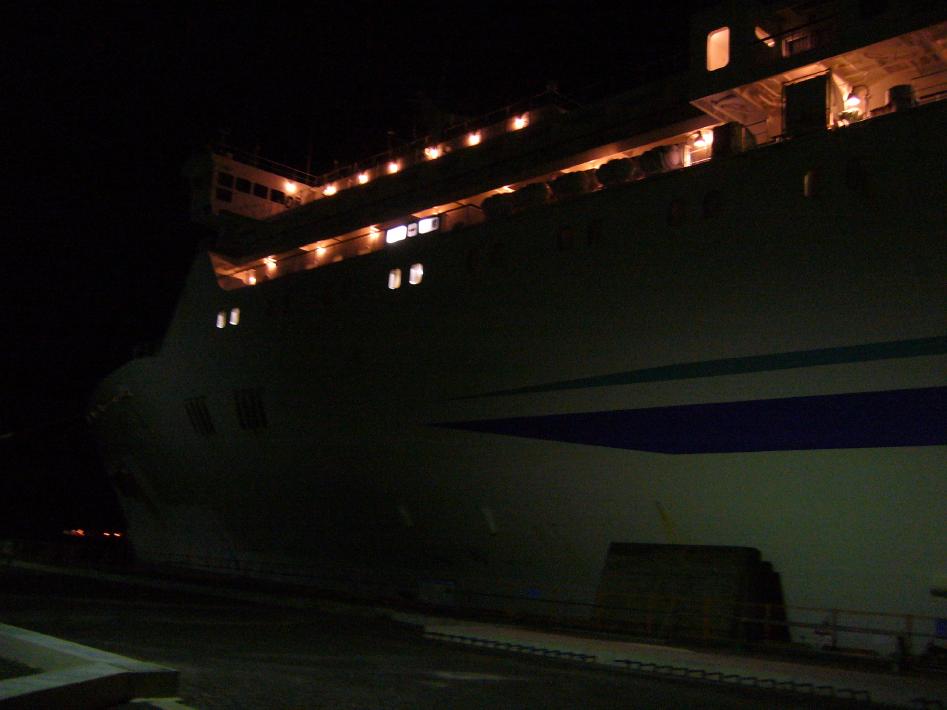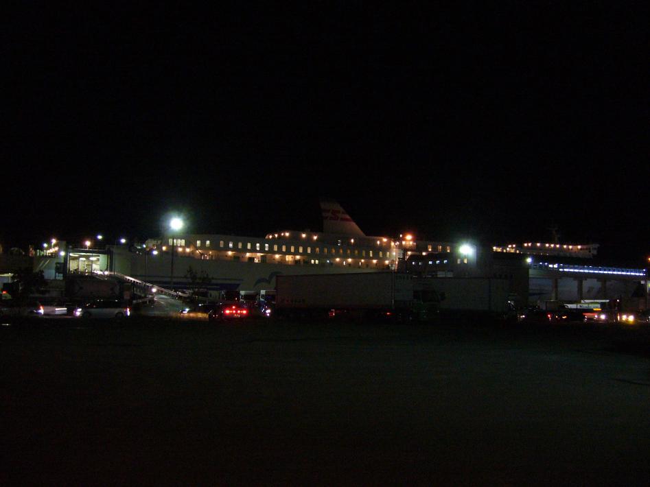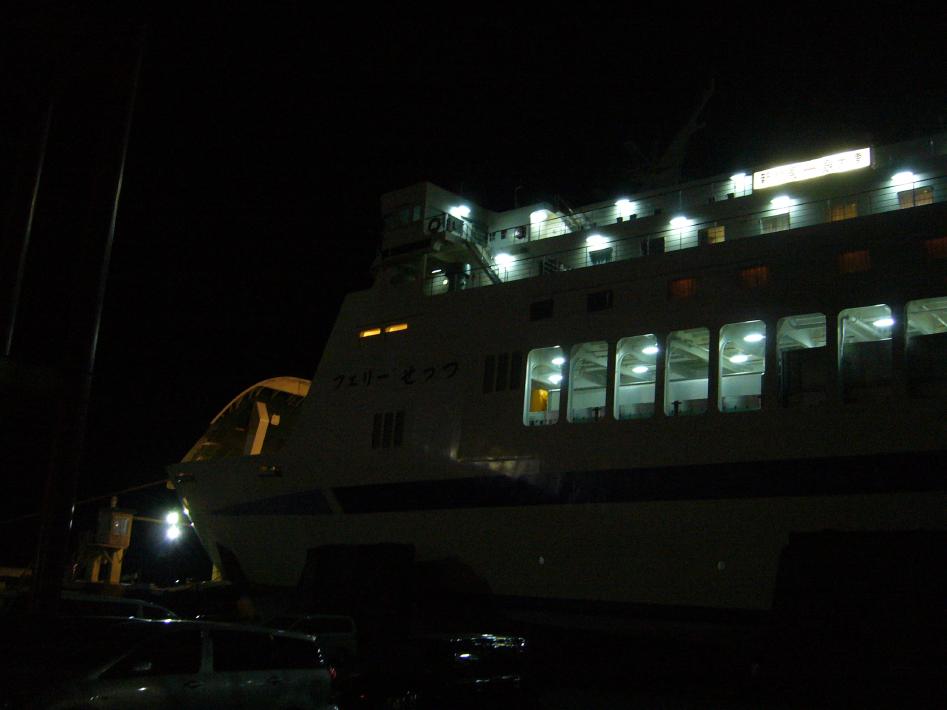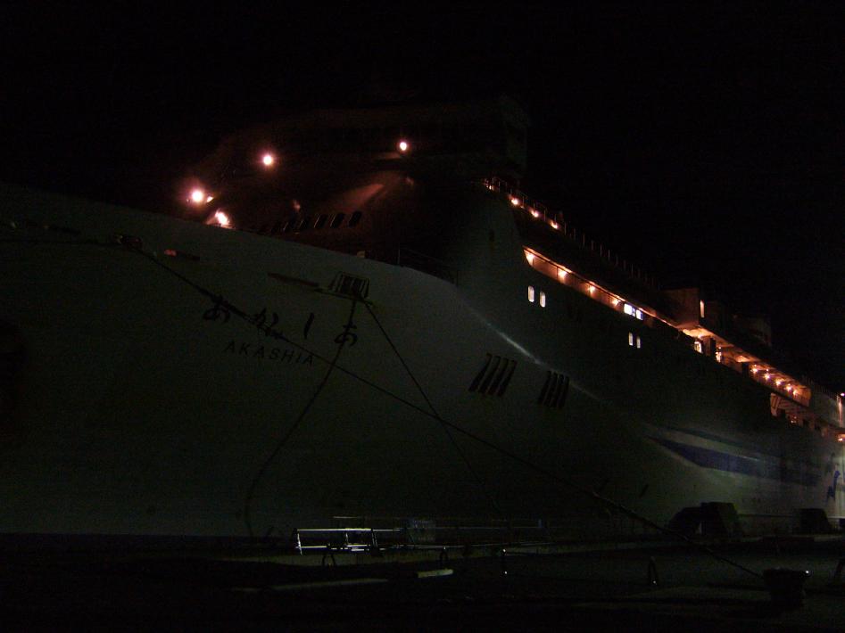 夕食後、2階待合室はツアー団体客を含めいっぱいでした。今回の2等座敷は自由席なので、早めに荷物を置いて並びます。荷物を置いた後、フェリーターミナルを出て今回乗船するフェリー「あかしあ」をS君と撮りまくりました。あかしあは、日本最長のフェリーで、大きすぎて全体を撮影出来ませんでした...。