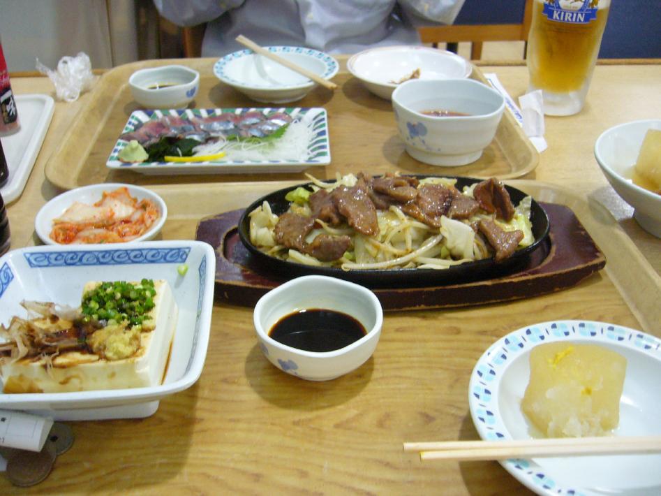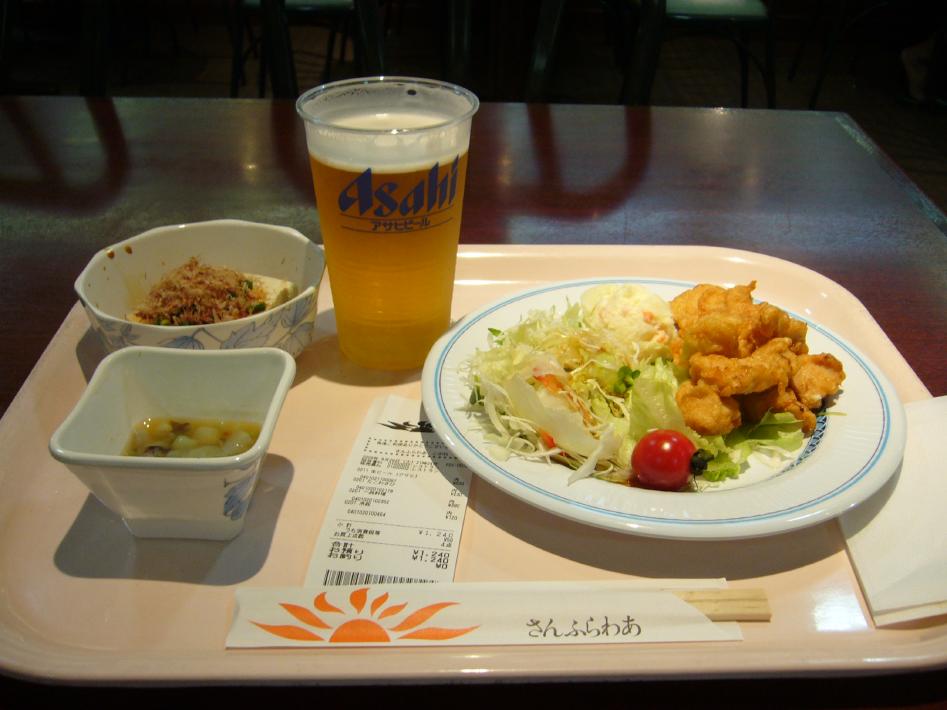 風呂を出る頃、出港15分前の船内放送が流れ、レストランが22時30分までと案内がありました。あわてて、レストランに行き遅い夕食をとります。さんふらわあこがねのレストランは、カフェテリア式で、好きな料理を選び最後にレジで精算する方式です。メニューは、既に売りきれたのか種類が少なかったです...。今回は、大分名物とり天390円・冷奴120円・たこわさ230円・生ビール500円を選びました。これで1240円は昨日の阪九フェリーより安いと思います...。