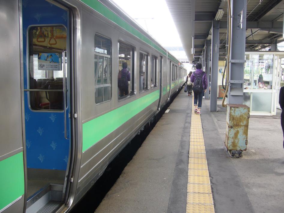 昼食後、千歳空港18時発福岡行JALに間に合うようにギリギリまで乗りつぶしをすべく、札沼線の石狩当別まで折り返す事にしました。 札幌発石狩当別行普通列車は、新型ディーゼルカーのキハ201でした。車内はロングシートですが、電車と変わらない加速で快適です。なお、S君は15時発特急オホーツクに乗るべく、札幌駅の隣駅桑園で折り返すため降り、別れました。S君は明後日まで北海道に滞在し、飛行機で福岡に戻る予定です。