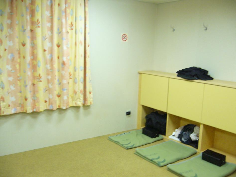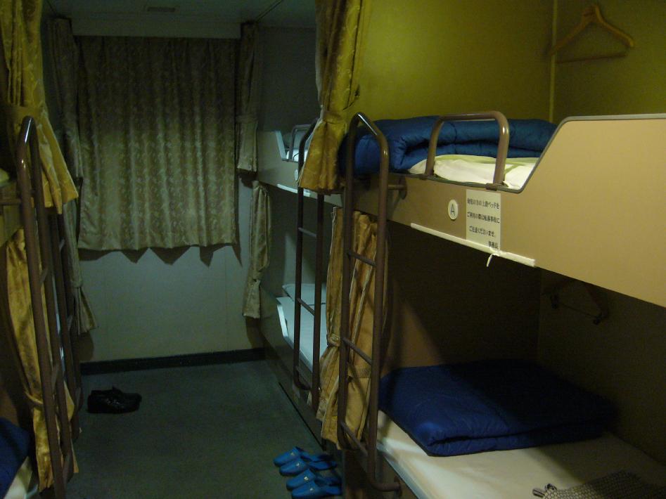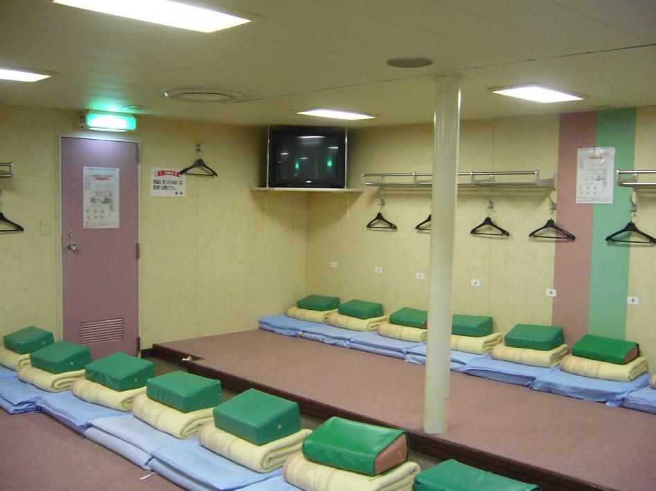 23時から徒歩客の乗船が開始かれ、はやめに並んだおかげで難なく2等座敷席のいい場所をキープできました。2等座敷席は、更衣室付きの12人部屋になっています。毛布と箱枕があり、1人づつロッカーがあり充分な設備です。