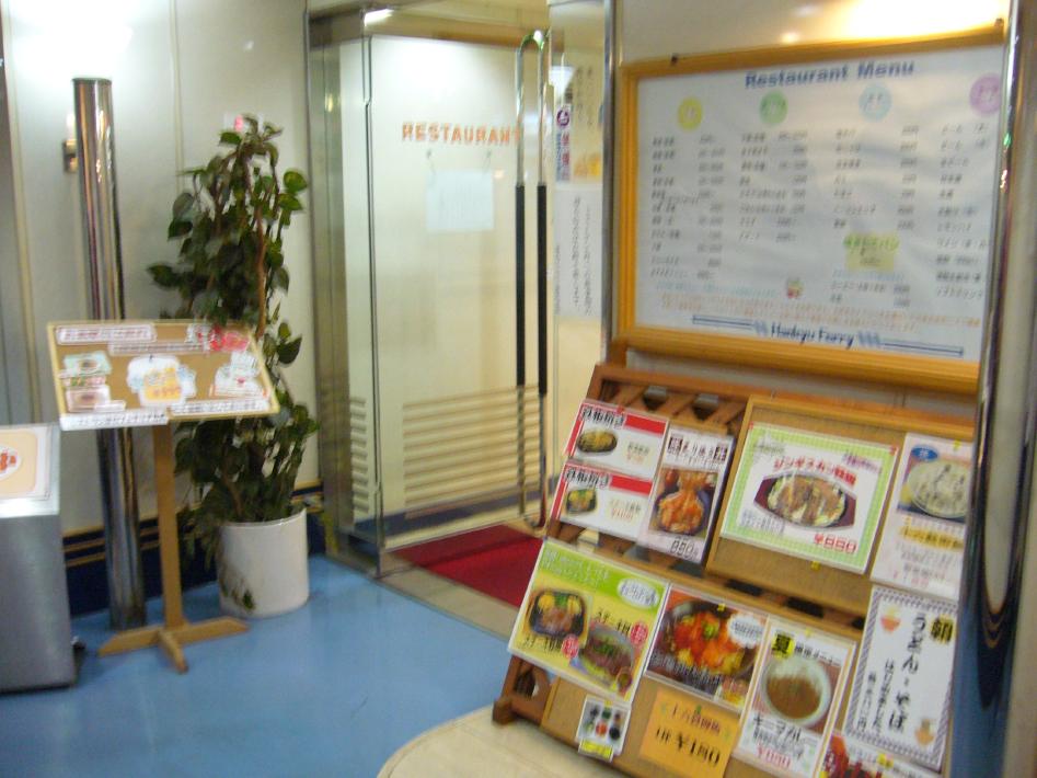 女性客室乗務員に聞くと、実は最近、レストランメニューを値下げしたとの事。国の高速1000円実施以来、フェリー会社は本当に頑張っています...。なお、生ビールのコップは、さんふらわあにしきはビールジョッキでしたが、プラスチックのコップでした。料理の品数も関西汽船のさんふらわあにしきの方がおでん等もあり多いようです。なお、自販機は、第3発泡酒350mlが150円と安くなっており、事前にコンビニで買い込む必要はないと思います。
