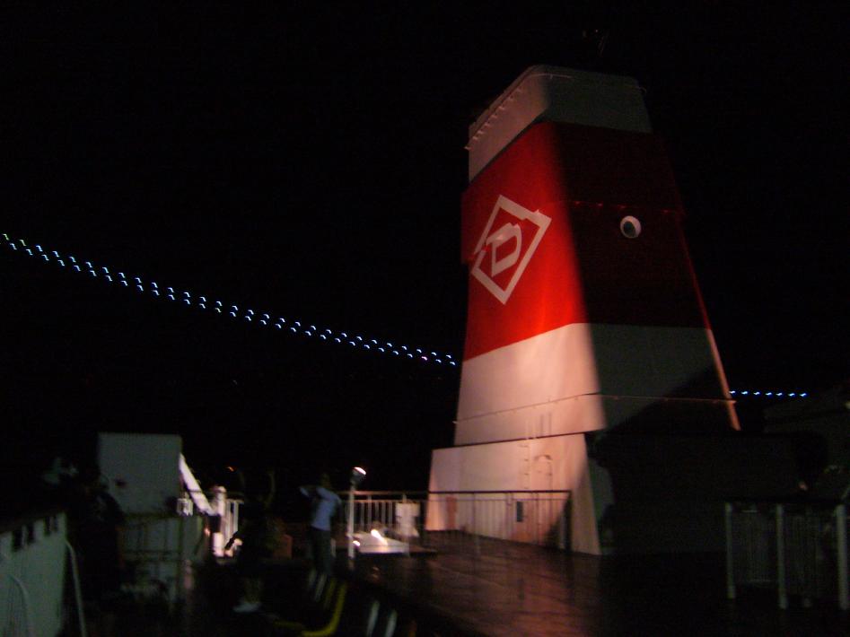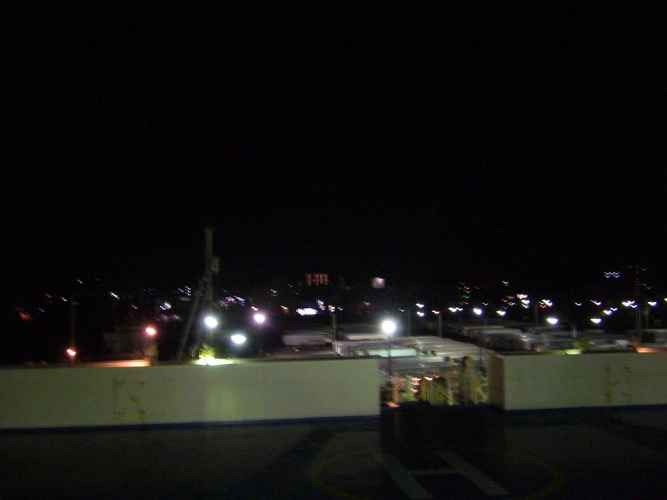 入浴後、外部デッキに出て出港シーンを見届けました。しかし、外部デッキが、時速30ノットで航行する高速フェリーの為、風の影響を受けにくい後方しかありません...。ただ、30ノットというスピードだと、船横側に出れるデッキがあると、強風に身体をもっていかれる危険性が高いので、仕方がないと思います...。なお出港後、舞鶴港の明かりが、次第に小さくなっていくのが印象的でした。