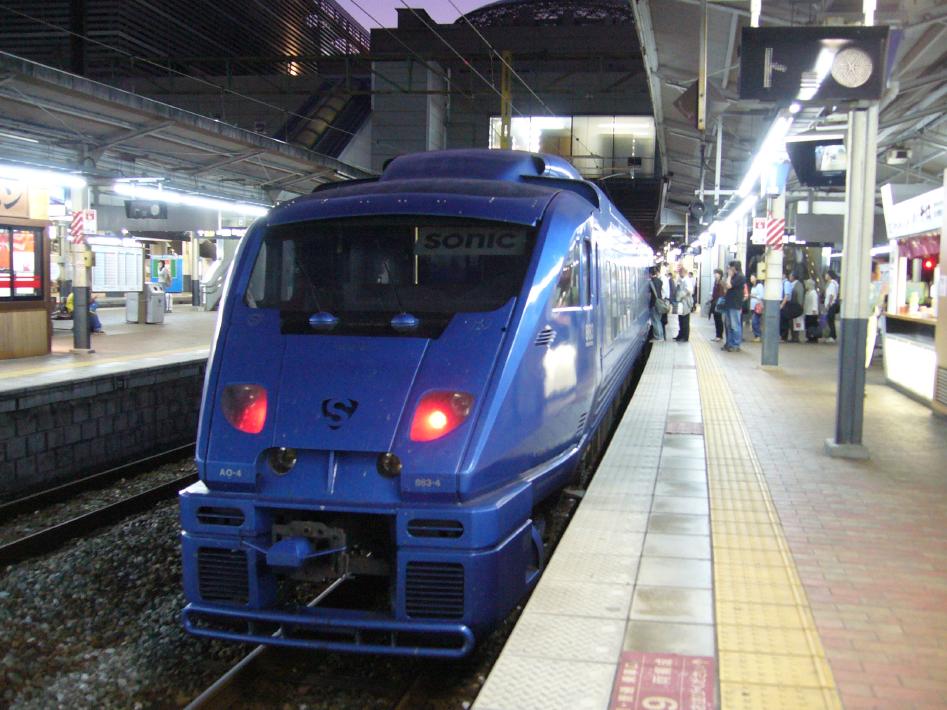 大分港到着後、すばやくさんふらわあこがねの全景を撮影し、大分駅行の連絡路線バスに飛び乗りました。バスは10分程で大分駅に到着。事前に金券ショップで買った博多までの4枚きっぷ(2450円)で、11時14分発特急ソニック24号にあわてて乗りました。