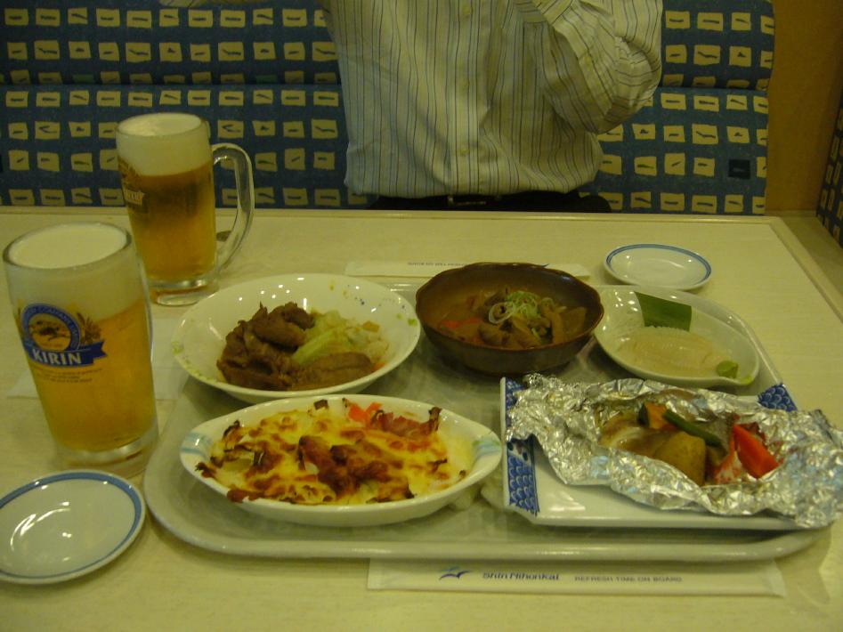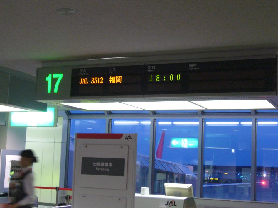 18時発福岡行はボーイング767で、片足をギプスしている乗客の扱いで手間取り、10分程遅れて出発しました。クラスJのシートは足元が広く快適でしたが、2時間30分程の搭乗時間は機内誌や新聞も読み飽きてしまい退屈でした...。機内サービスも飲み物と小さなせんべい1枚のみで、同じ搭乗時間なら国際航路の方がいいと実感しました...。