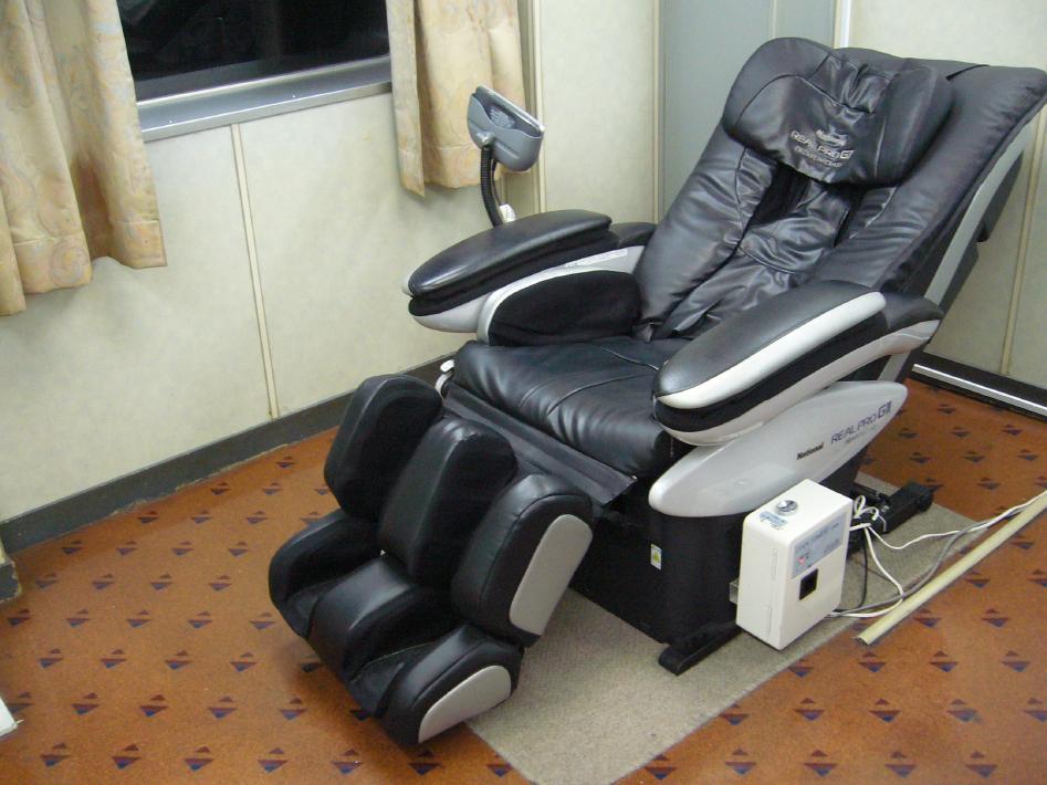 昼食後、まさに晴れ渡る日本海を後方外部デッキから眺めたり、S君とゲームセンターのエアーホッケーに興じたりと楽しく時間が過ぎていきます。特にプロムナードで昼から缶ビールを飲むのは最高です。酔いがまわった後、マッサージルームでフェリーに乗船すると習慣化しているマッサージ機で重症の肩こりを癒しました。