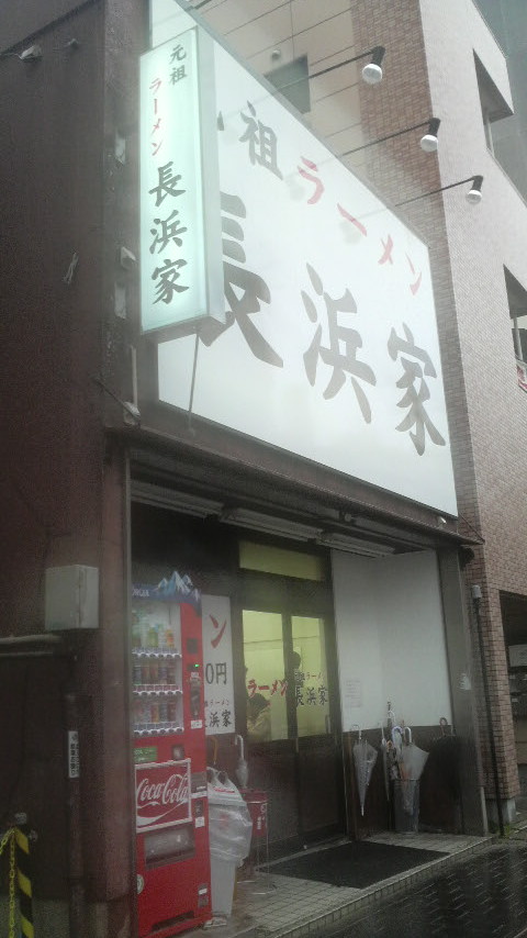 雨が降りしきる中、昼食を食べるべく元祖ラーメン長浜家に行ってみると、既に3人程並んでいました。店の回転が早いので、すぐにグループ客が店を出ていき自分の順番になりました。
