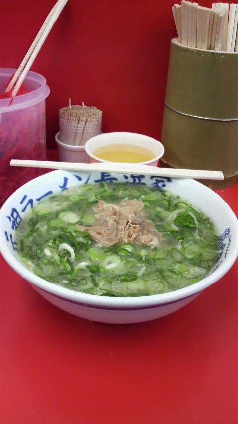 今週月曜「元祖ラーメン長浜家」に行った時は、行列が4〜5名出来ていました・・・。待つ事3分ほどで私の順番となり、カウンターの席に座りました。相変わらず和気あいあいとした雰囲気で、麺の固さを店に入ってすぐ店員さんが聞いてきます。今回は「カタネギヤマ」で頼みました。今日は店内も混んでいます。