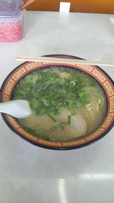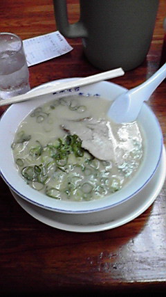 頼んで時間も経たずにすぐラーメンが来ました。一見濃そうなスープに青ネギ・チャーシューのシンプルな組み合わせです。スープを飲んでみると、若干塩分がきつめですが、オーソドックスな豚骨味で美味しいスープでした。麺は、ツルツル感が際立っているような気がします。