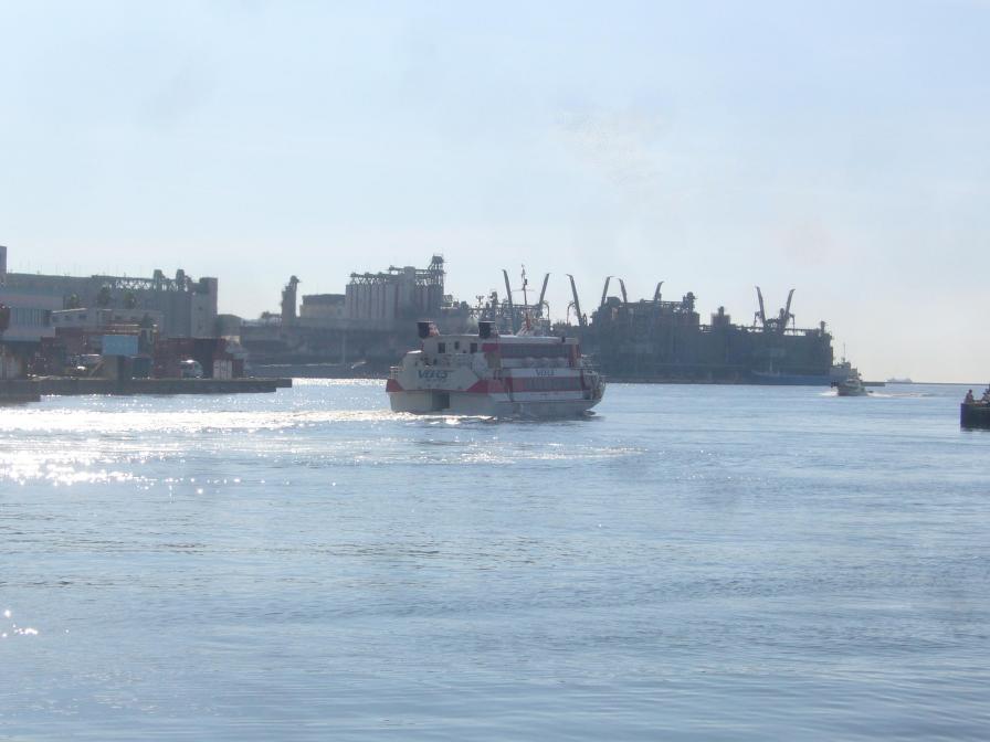 セミナー終了後、再び博多港に寄ってみると、ちょうど九州郵船のジェットフォイル「VENUS」を撮りまくりました。梅雨の明けた博多港の空は、まさに夏の空でした。
