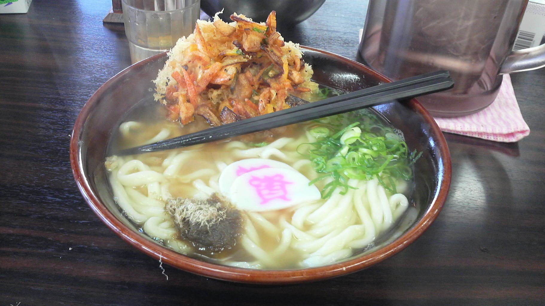 5分以上待ってやってきたうどんは、ごつっとしたかき揚げの天ぷら・青ねぎ・「資」の字入りのかまぼこが載った細麺のうどんでした。つゆの色は薄めのようです。なお、天かすととろろ昆布が入れ放題なのがうれしいです。