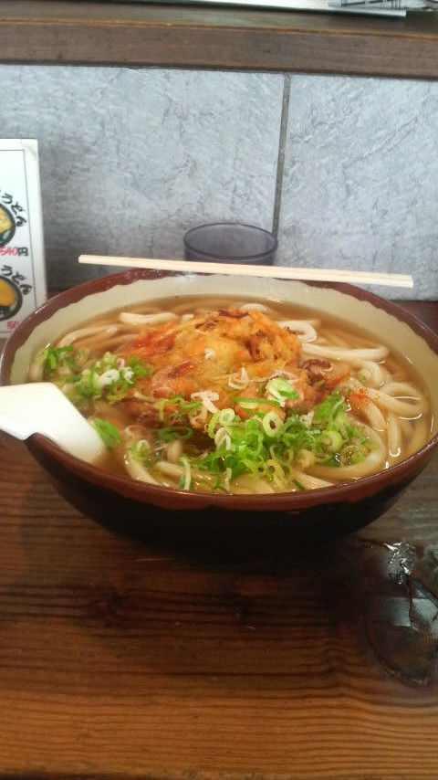 今回は、かきあげうどん大盛(540円)を頼みました。昼食のラッシュが過ぎた店内は、ちらほら食べているお客さんはいるものの閑散としています。