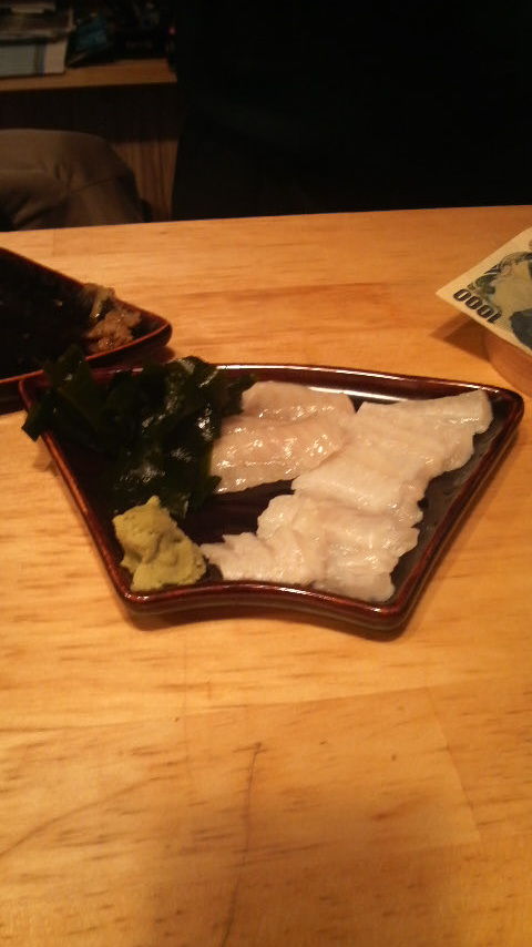 前回以降、お店に行くとまずは玄ちゃんセット(生ビール+刺身、干物+小鉢で900円)を頼みます。お金はテーブルの皿に入れておき、注文の品と引き換えにその都度支払う方式です。
