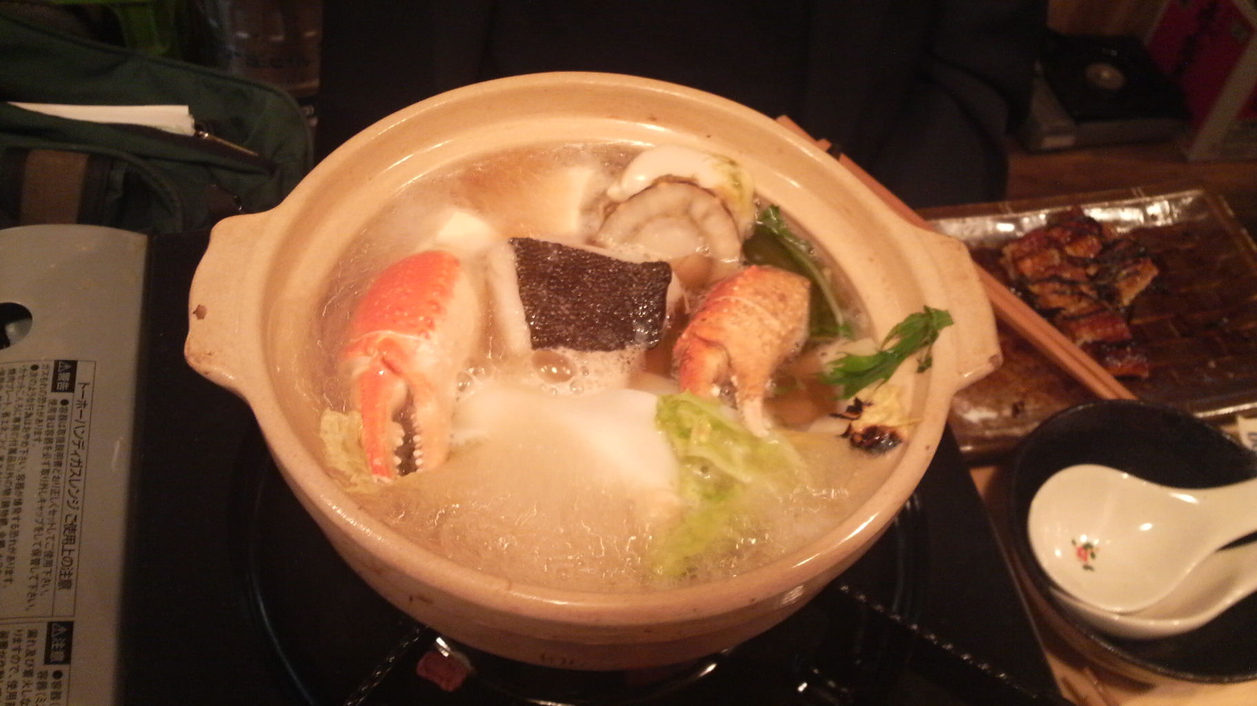 玄ちゃんセットの後は、その都度お店のオススメを肴に飲みました・・・。寒くなった季節柄、海鮮なべ(1000円)を肴に「立ち飲み屋」で飲めるのはスゴイことです・・・。鍋の具材は小さめの土鍋に蟹爪・ほたて・真たら・やりイカとしっかり入っています。鍋の後にしっかり「雑炊(300円)」を頼みました。