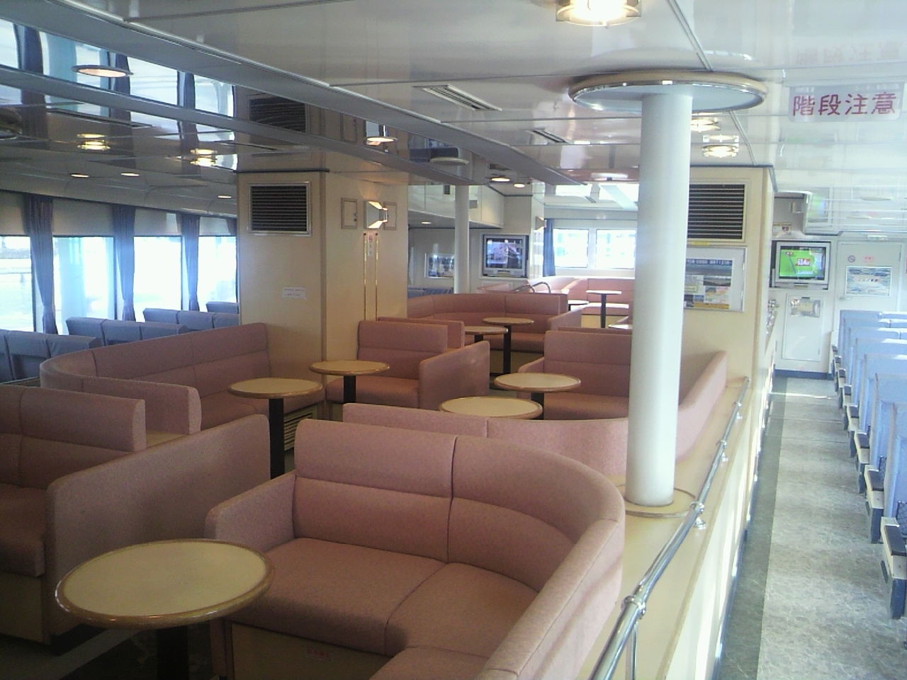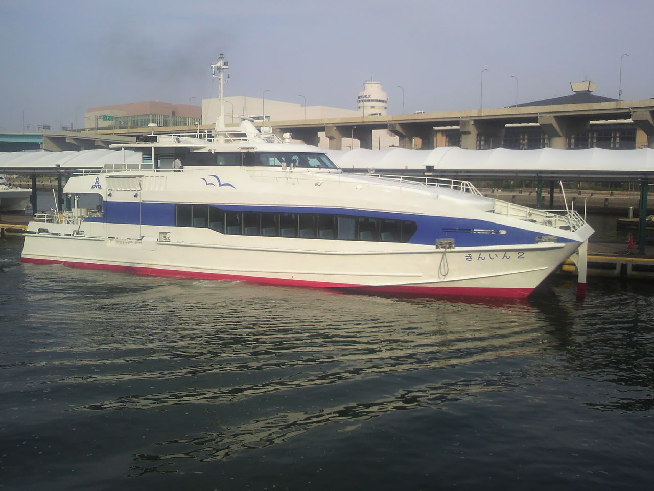 乗船したのは、双胴型高速船の「きんいん2」です。双胴船のせいか、船内客室も広かったりします。私はさっそく2階後部外部デッキに座りました。初夏の博多湾の潮風に当たりながら快適です(^^)。