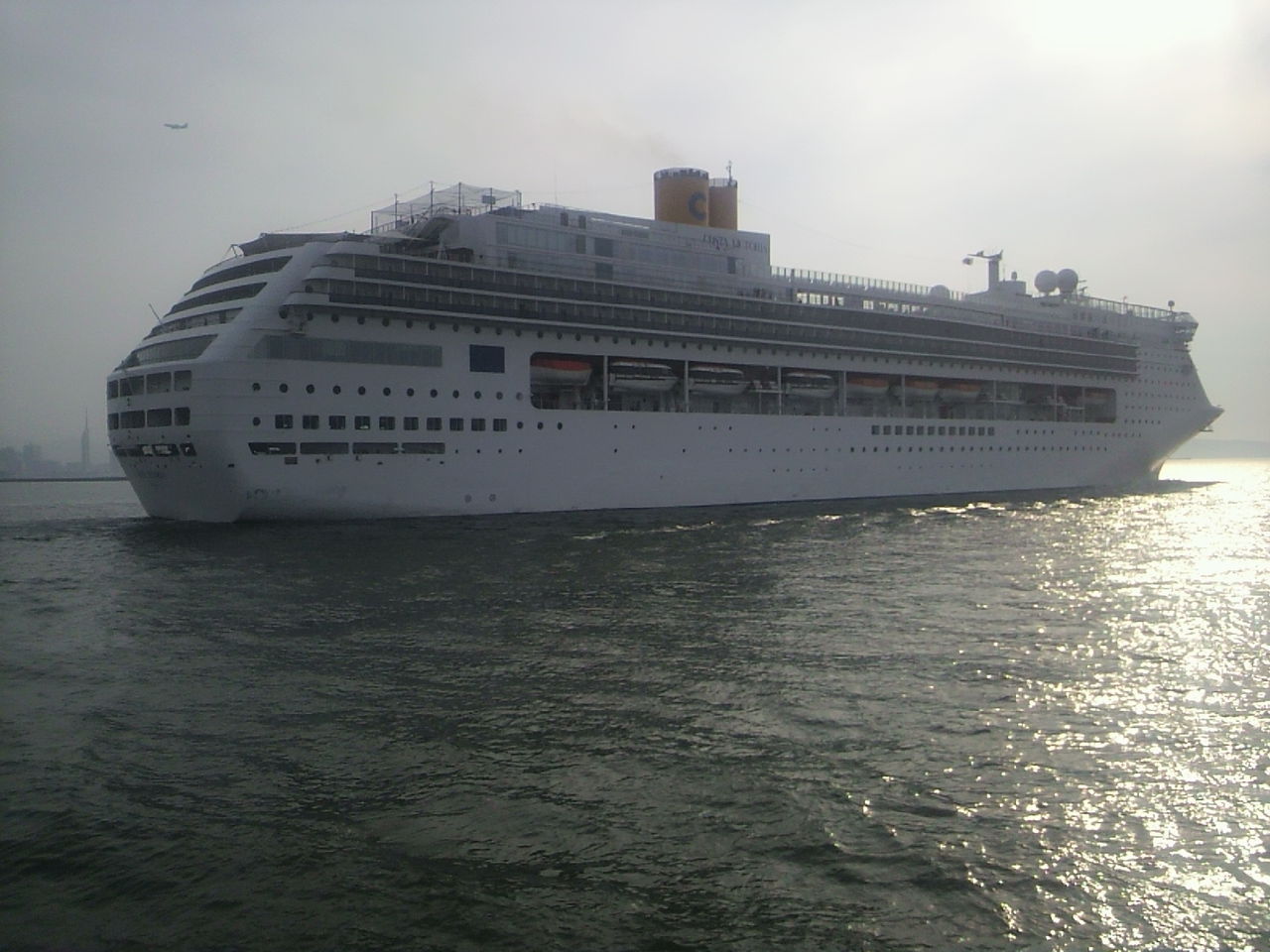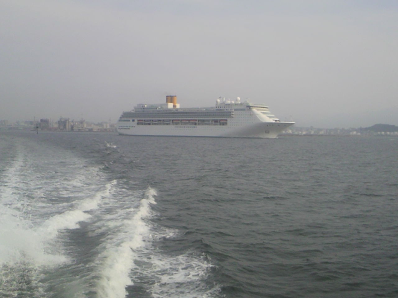 出港後、幸いちょうど寄港していたクルーズ客船「COSTA VICTORIA」が、出港し博多港を抜け出ようとしていました。思わず外部デッキより撮りまくりましたが、逆光かつ中途半端な写真になってしまいました。。。約15分ほどで西戸崎に到着。