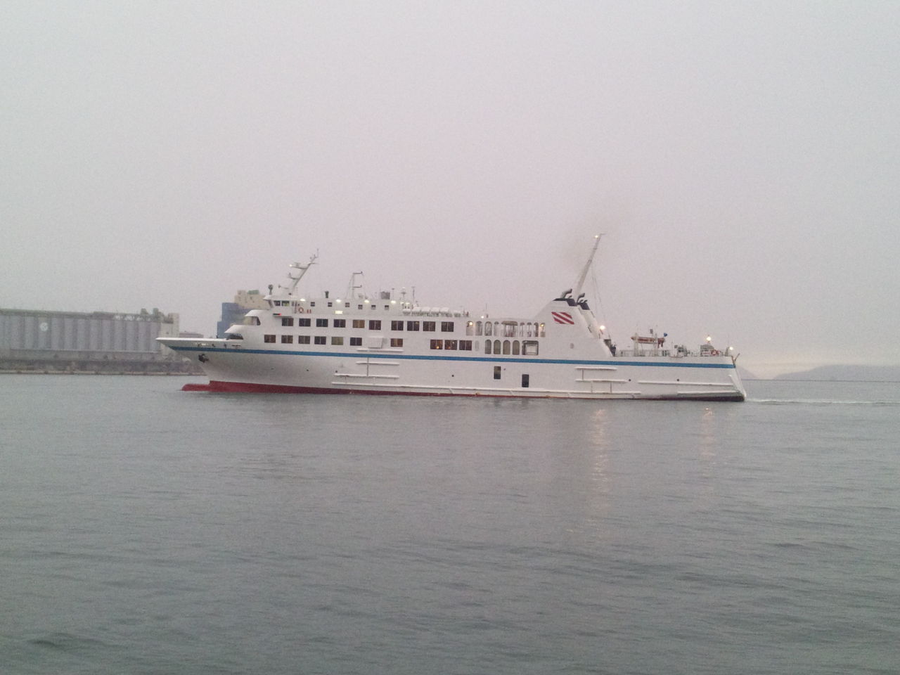 朝食を食べてる途中、レストランの窓から明石大橋の通過を見る事が出来ました。朝食後、外部デッキより神戸港入港シーンを見届けます。神戸港8時30分ほぼ定刻着でした。