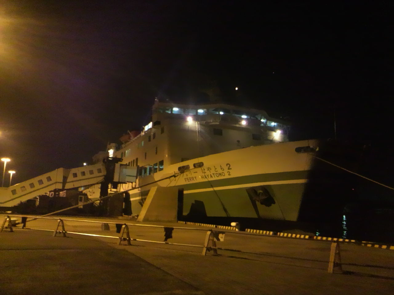 朝食後、バタバタと後方外部デッキに出て入港シーンを見届けます。あたりはまだ暗闇です。東予港定刻朝6時到着。
