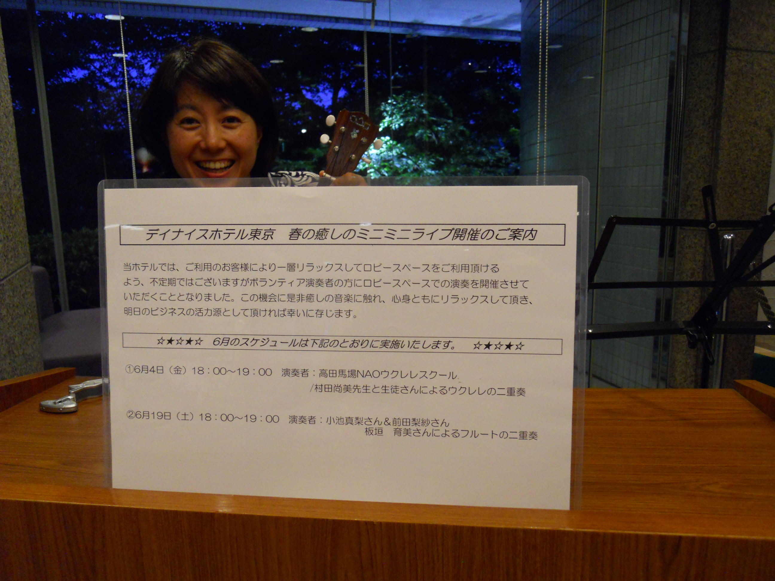 ホテルのロビーでの、演奏ボランティアは、 NAOウクレレスクール初。