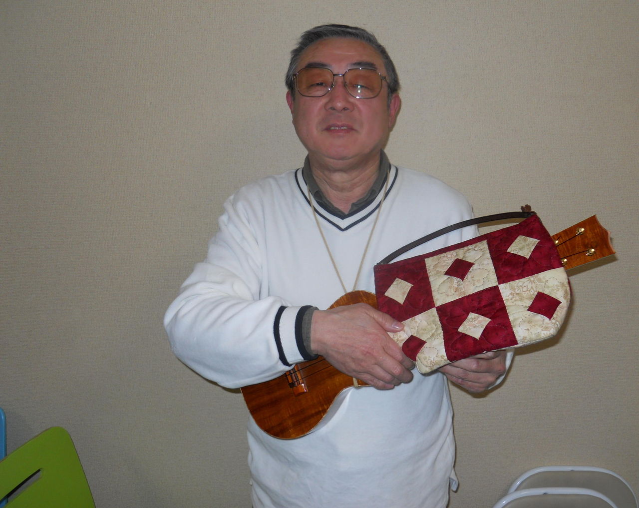 すごい! 今日は、杖一本で、ウクレレレッスン。
