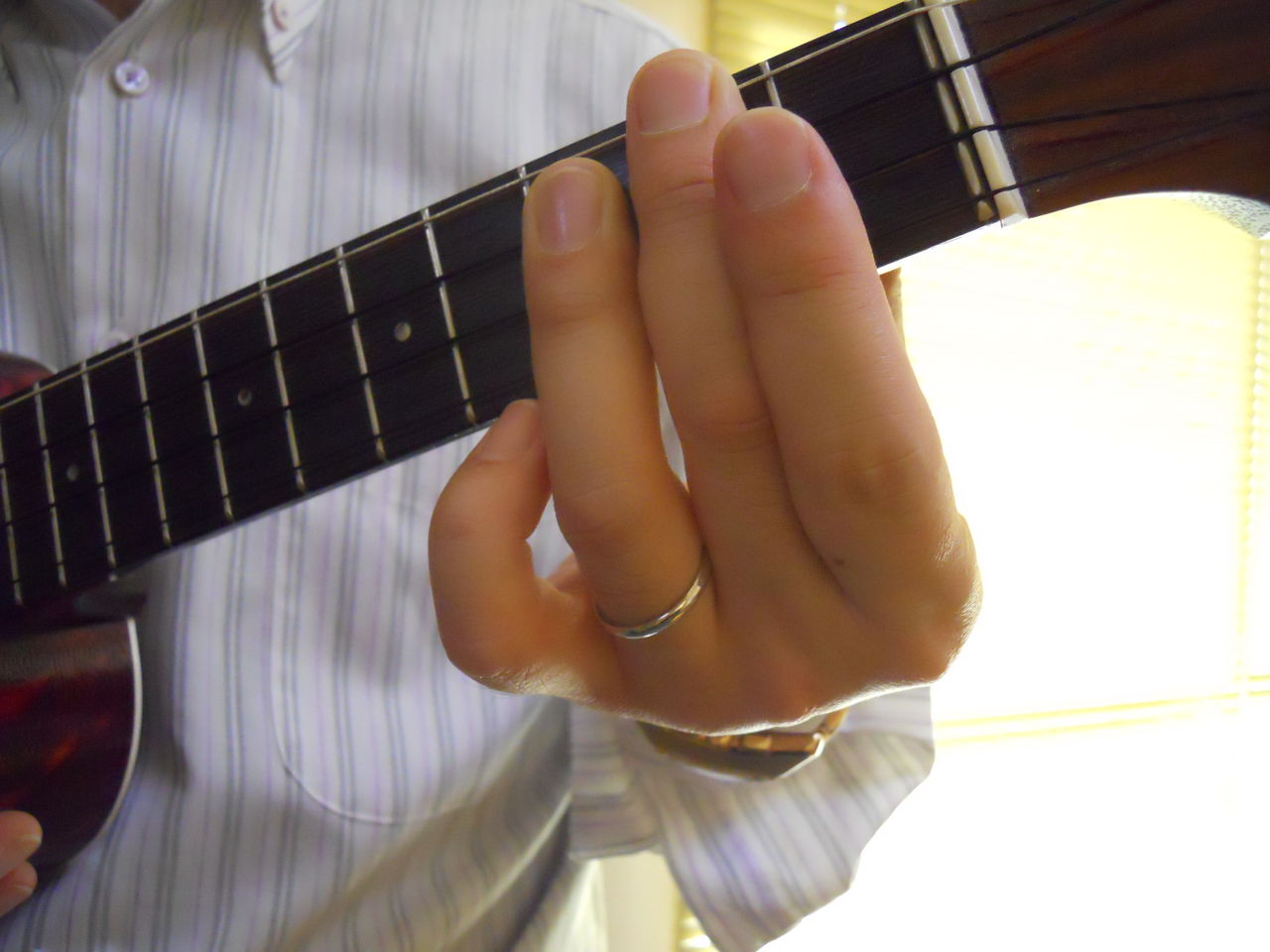 ウクレレの持ち方。コードチェンジ時の指使いをレッスンする教室です。