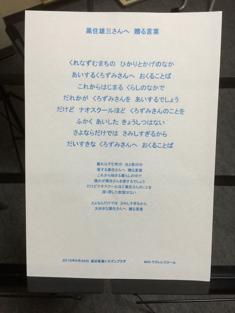 男性ウクレレ隊の発表曲の前に、黒住さんに贈る言葉を歌いました。