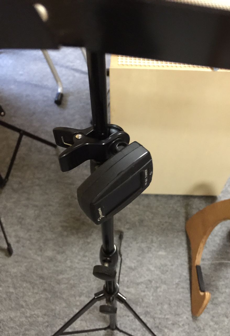 生徒さんの忘れ物の、クリップ式チューニングメーター。
