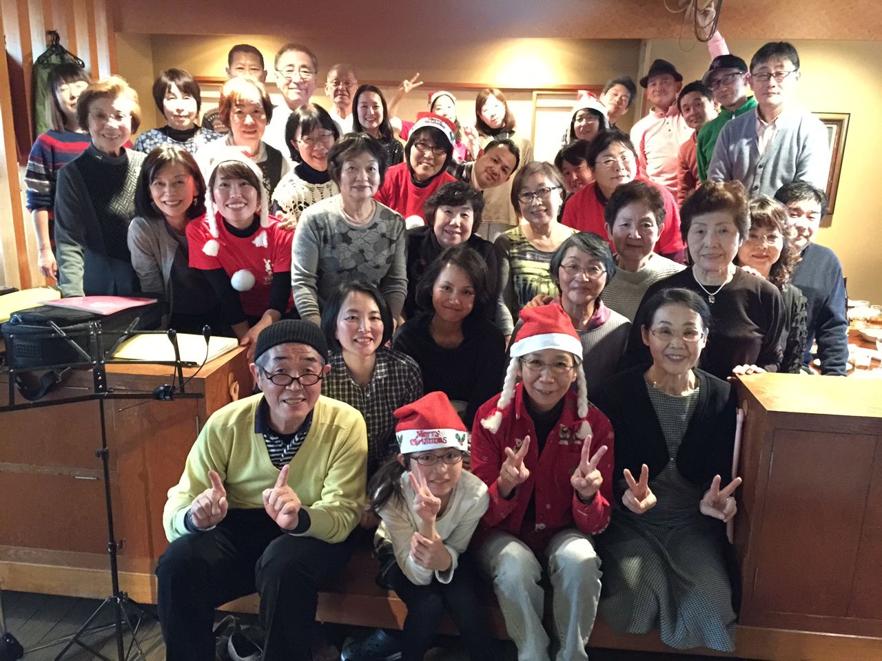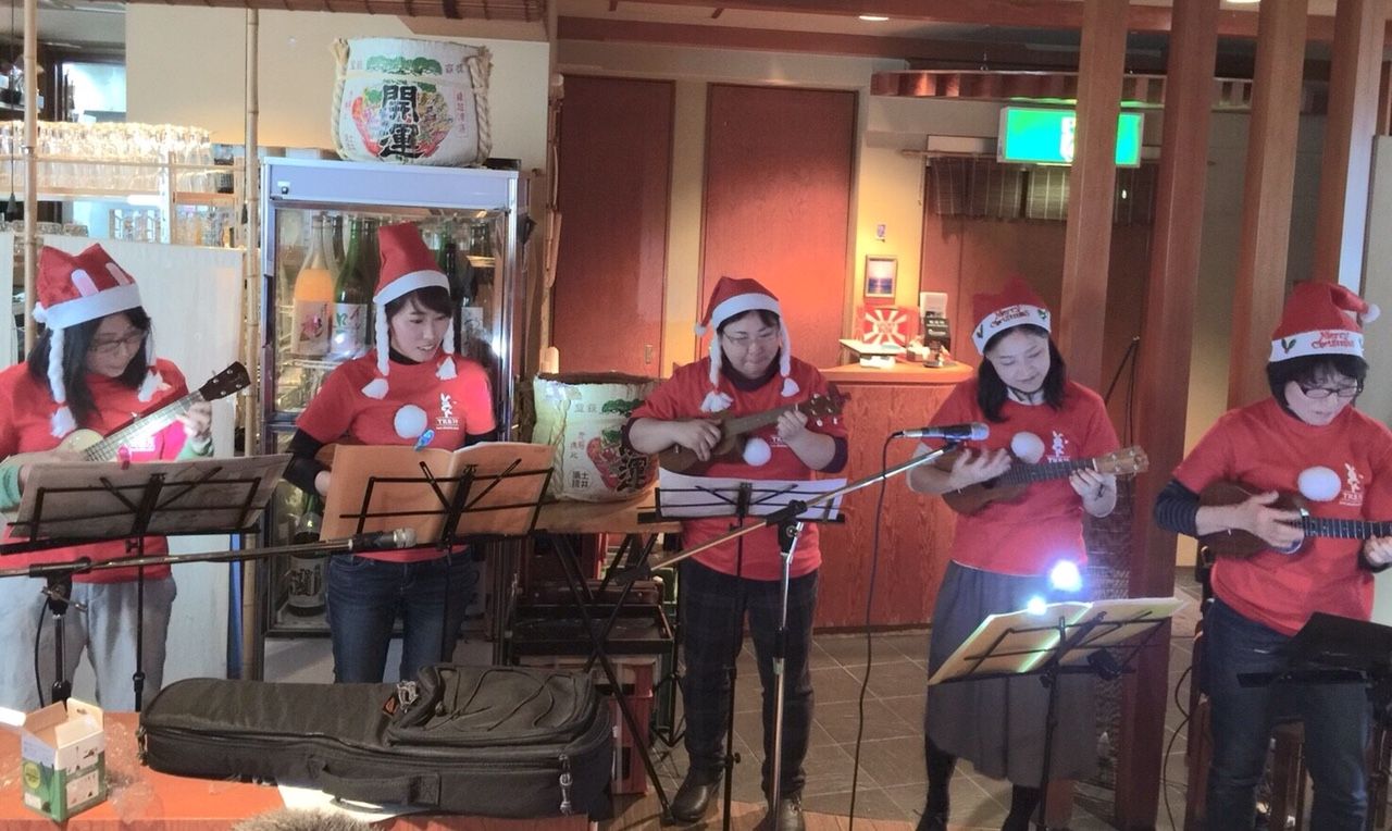忘年会は参加者全員でウクレレを弾きながらクリスマスソングを歌います。