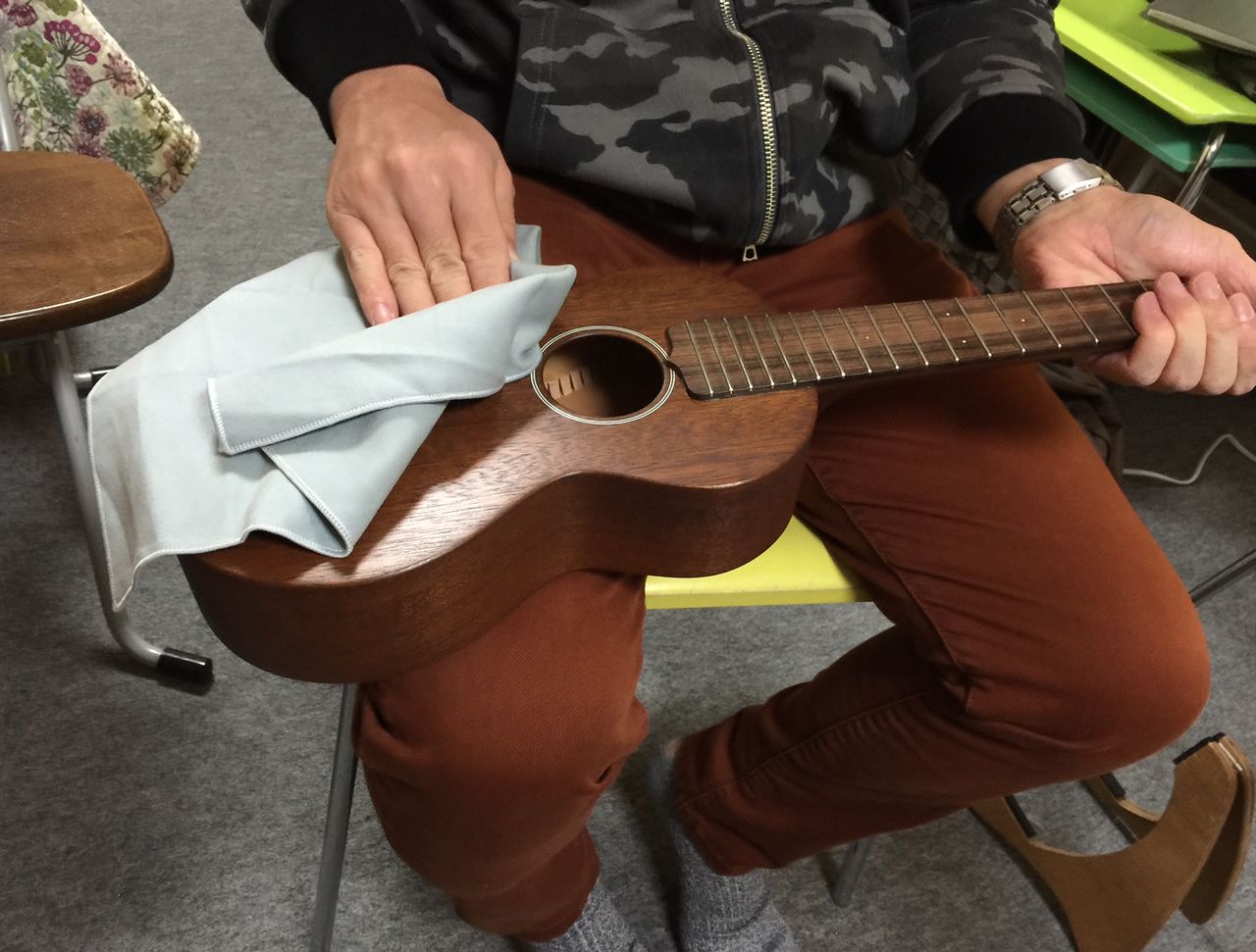 理由は、ウクレレを抱える姿勢を受講生に見てもらうため。
