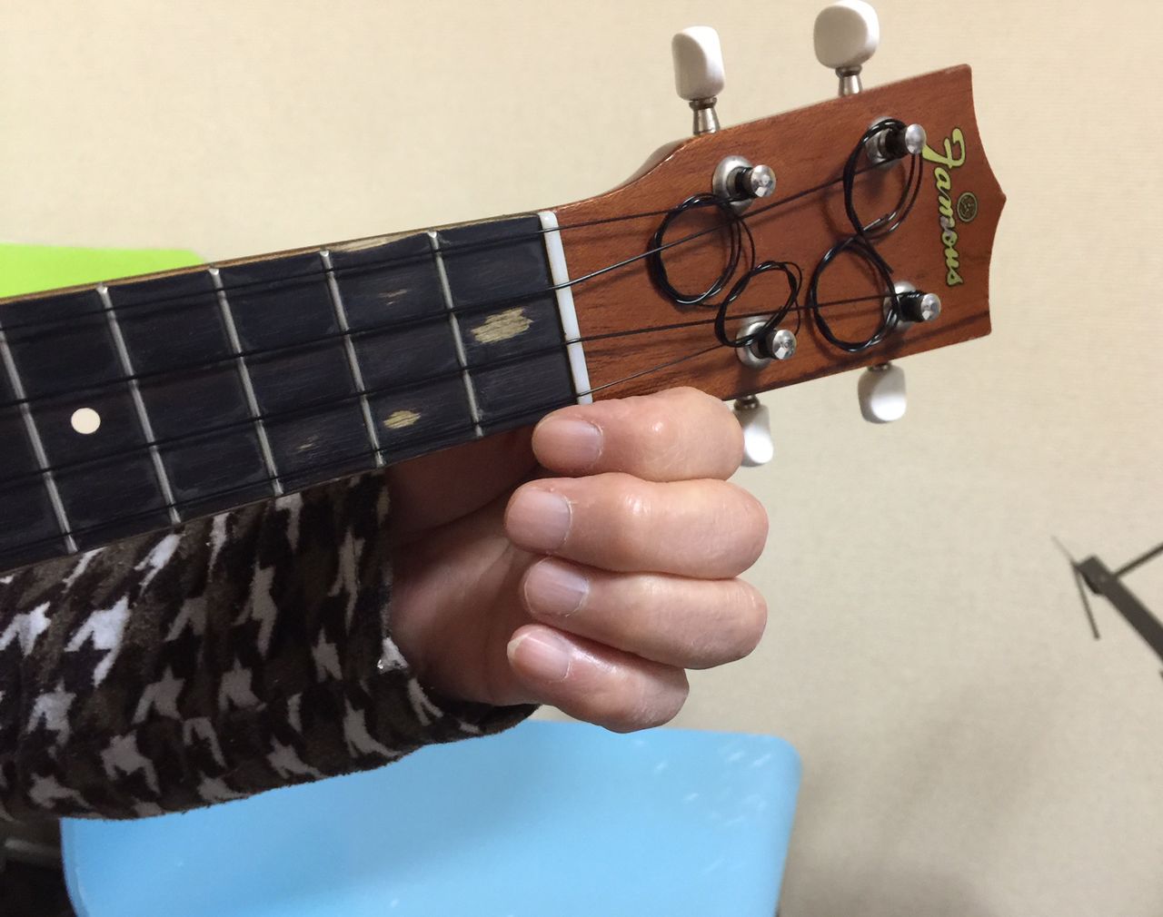 ウクレレを胸の前で抱える姿勢と、ネック裏の親指の位置と向きが