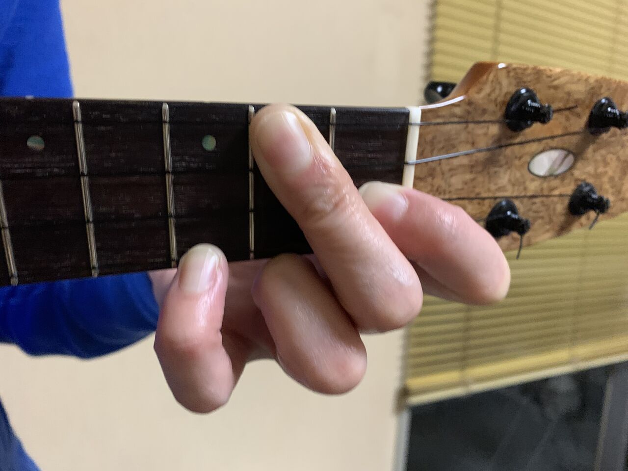 両手脇を閉じて、ウクレレネック裏の親指の位置が安定したので、