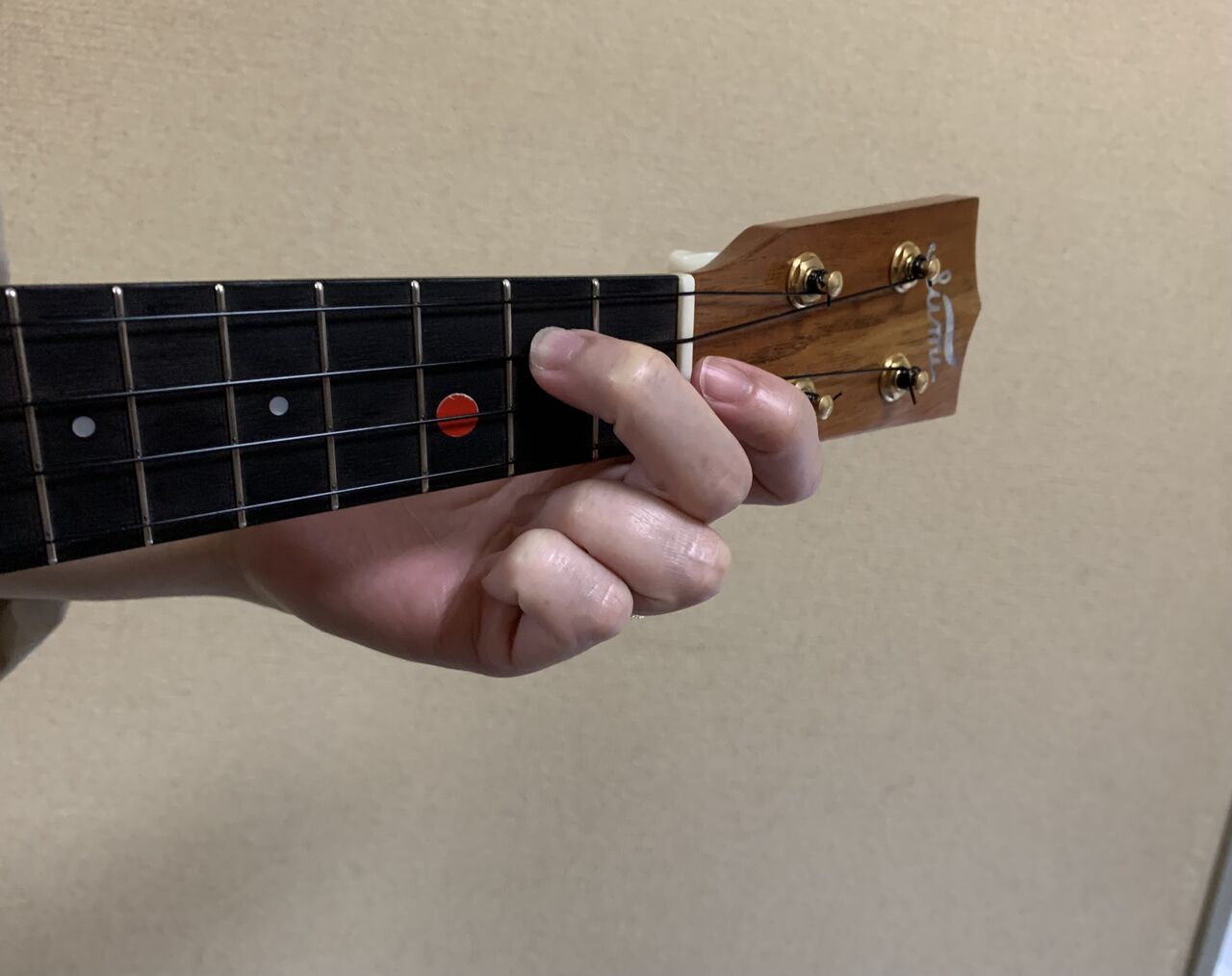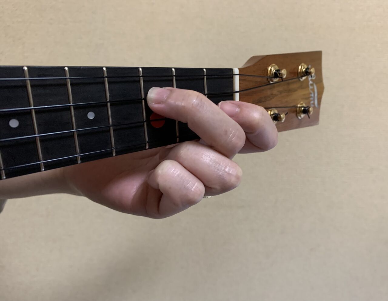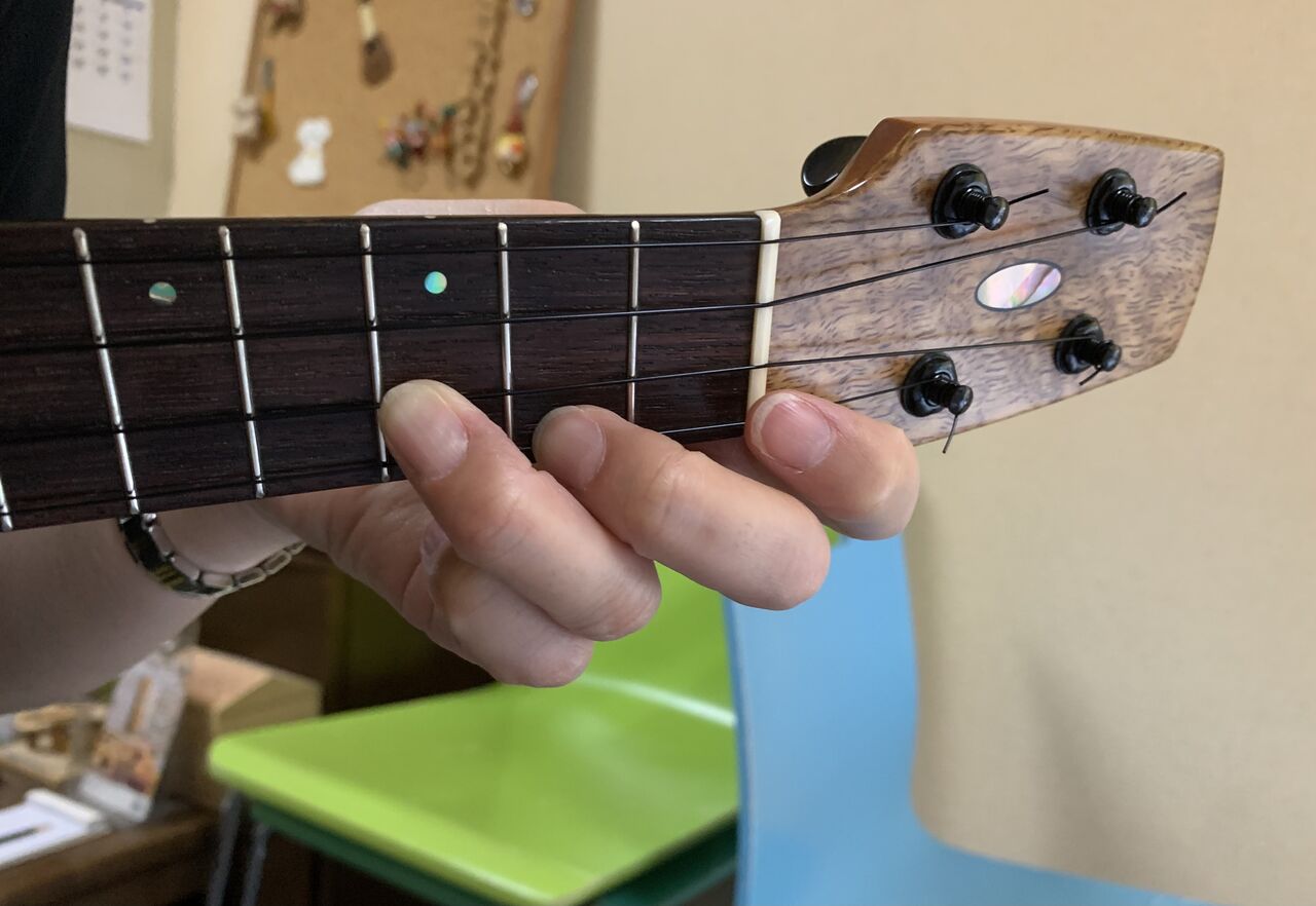 人差し指の位置を、2弦の線上、ナット寄りにしてから、