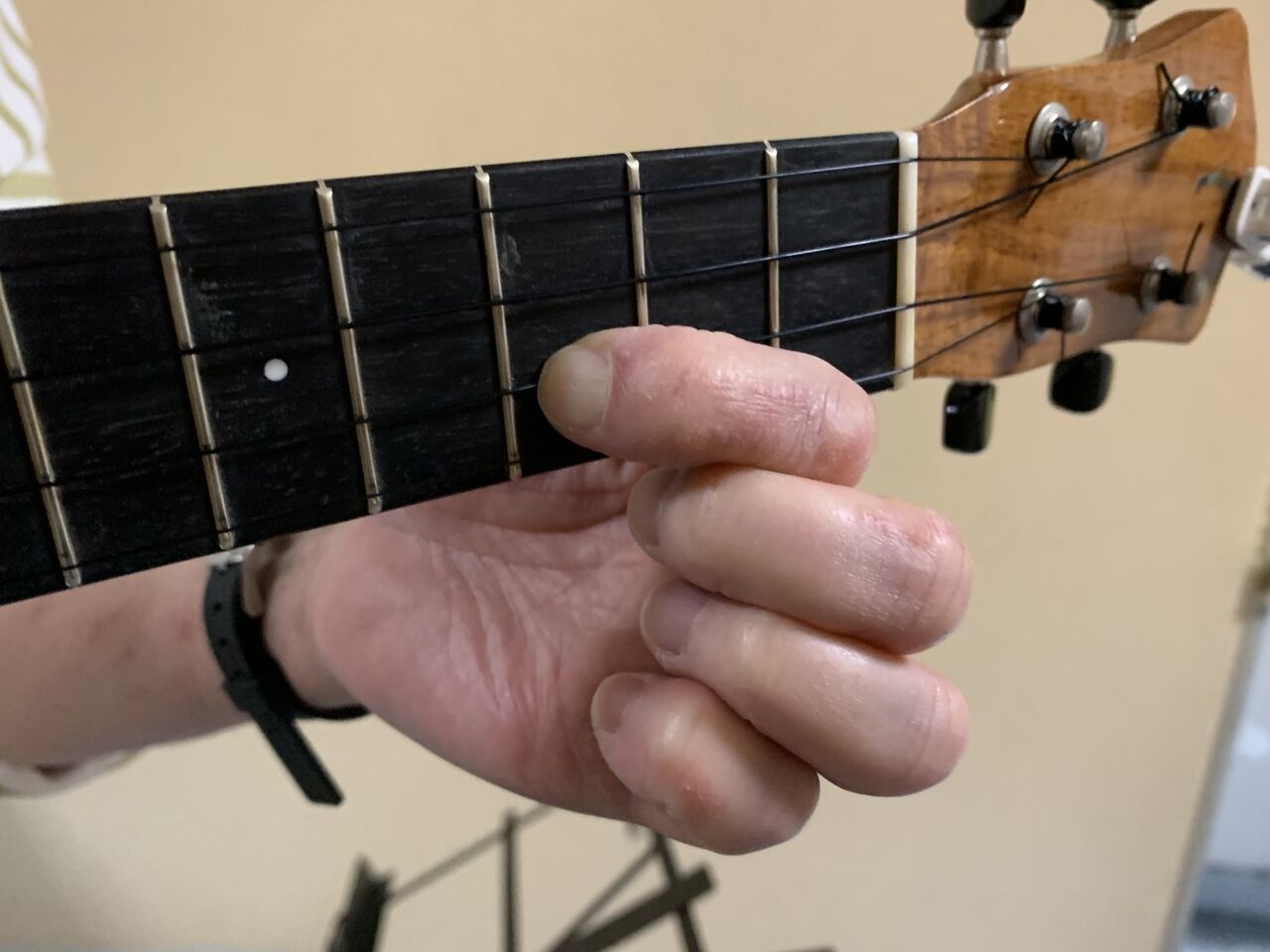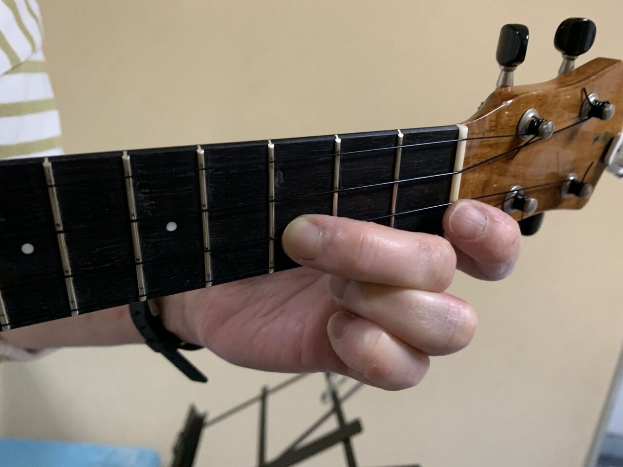 写真は、Dm7コード(D・F・A・C)押さえ方。